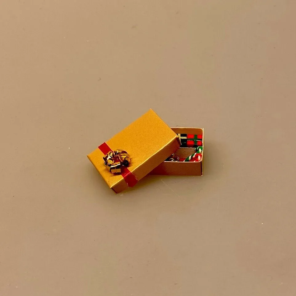 Skøn lille æske af pap med aftageligt låg. Den rektangulære æske er guldfarvet og dekoreret med rødt bånd og en guld roset. Æsken er fuld af forskellige blandede julesager. På rødt silkepapir ligger små pakker, slikstokke og sølvkugler, samt glasrør og flitterstads. Pynten sidder fast i æsken, så det bliver hvor det er, også hvis æsken tippes og stilles skråt.