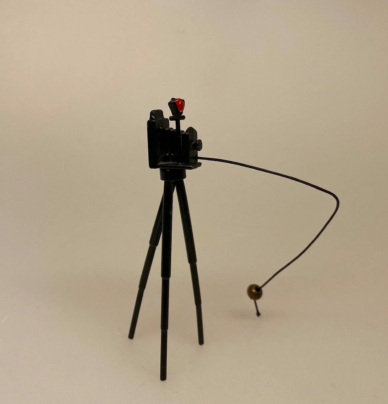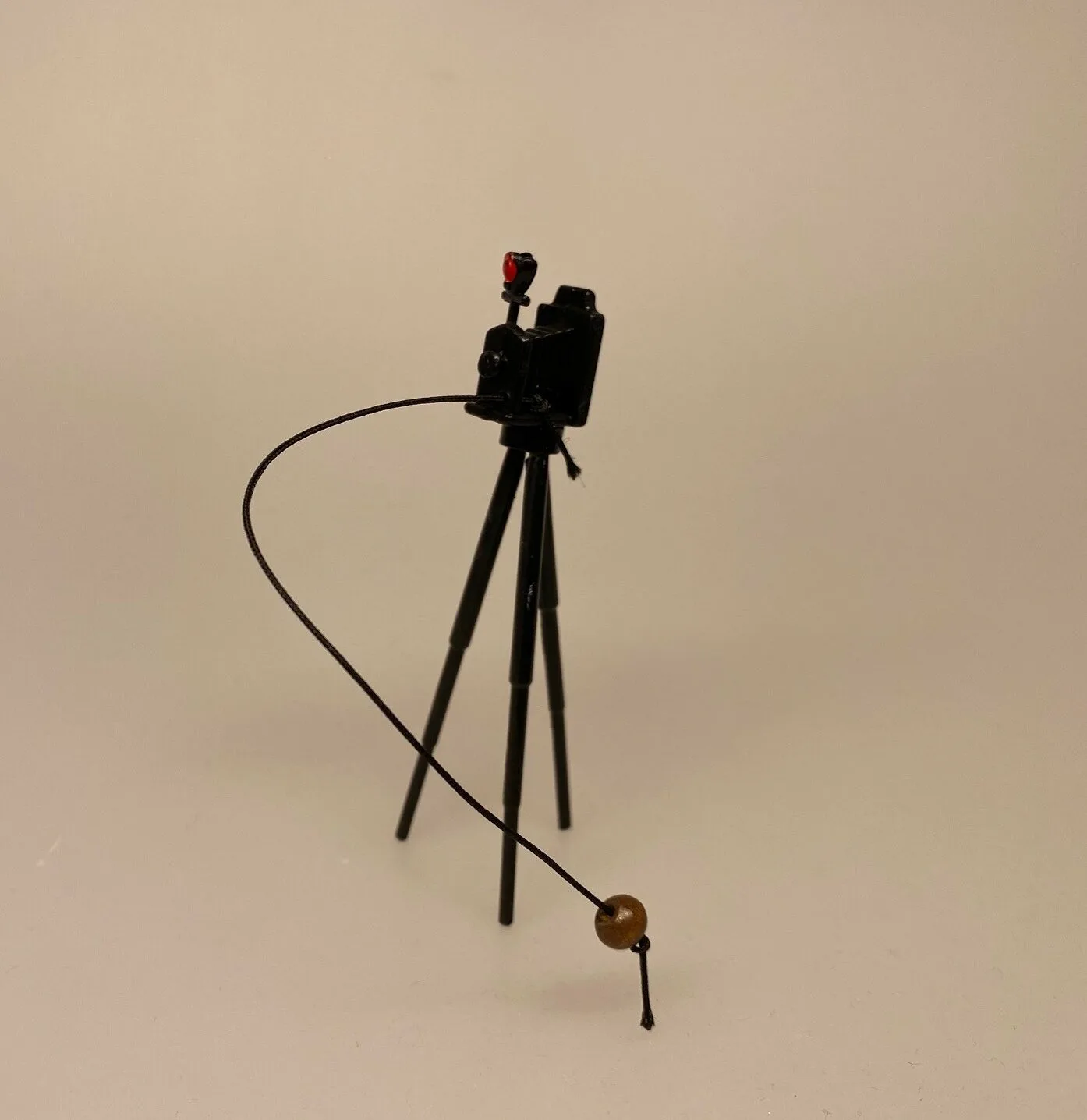 Kamera i miniaturestørrelse. Herligt udstyr til fotografen i dukkehuset – kameraet er af den gammeldags slags i harmonika design og håndholdt udløser, samt trebenet stativ. Både ben og kamera er sorte, udløseren er brun.