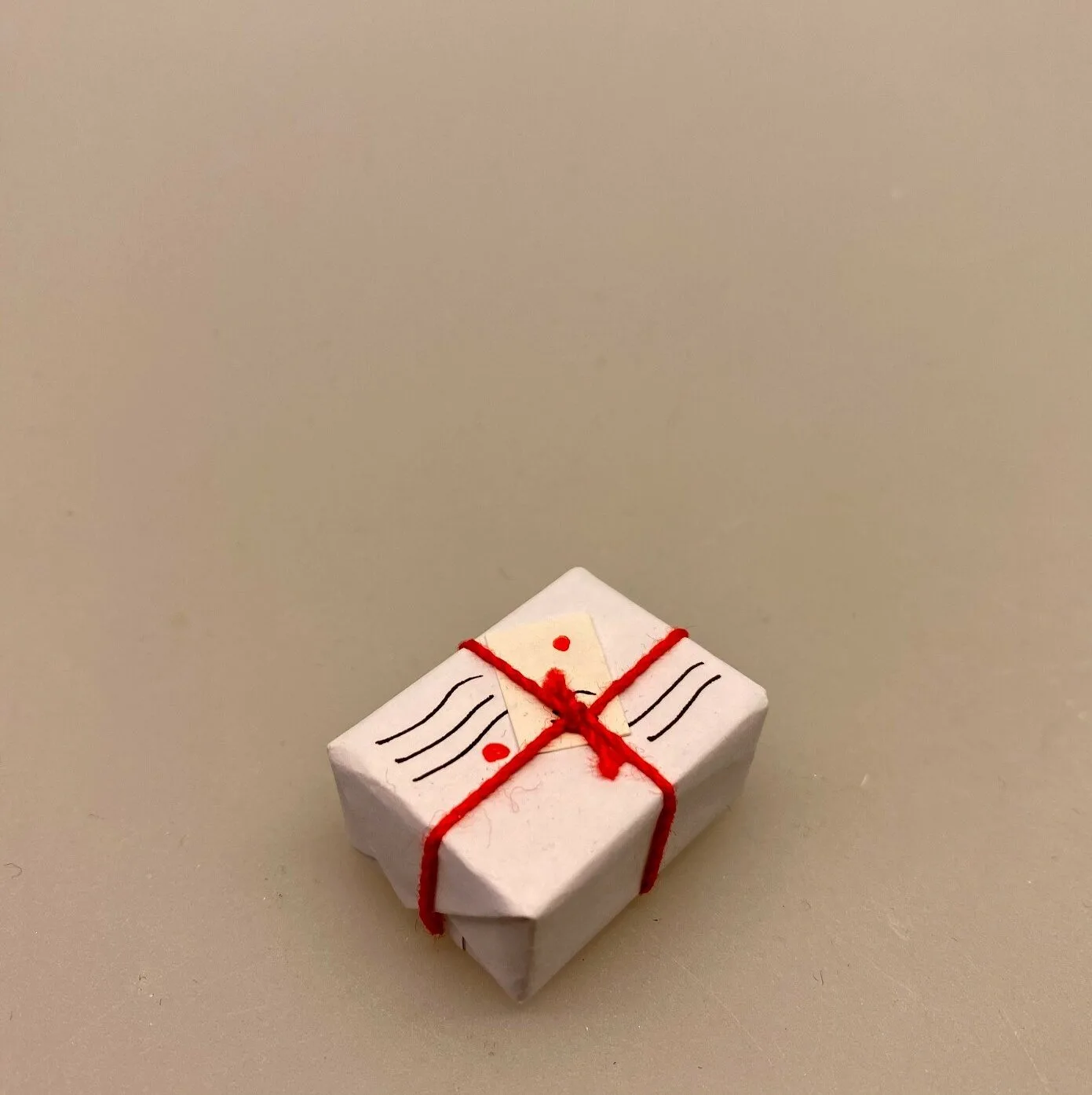 Flot lille postpakke indpakket i hvidt papir, med rødt sejlgarn og postsedler med rødt stempel.