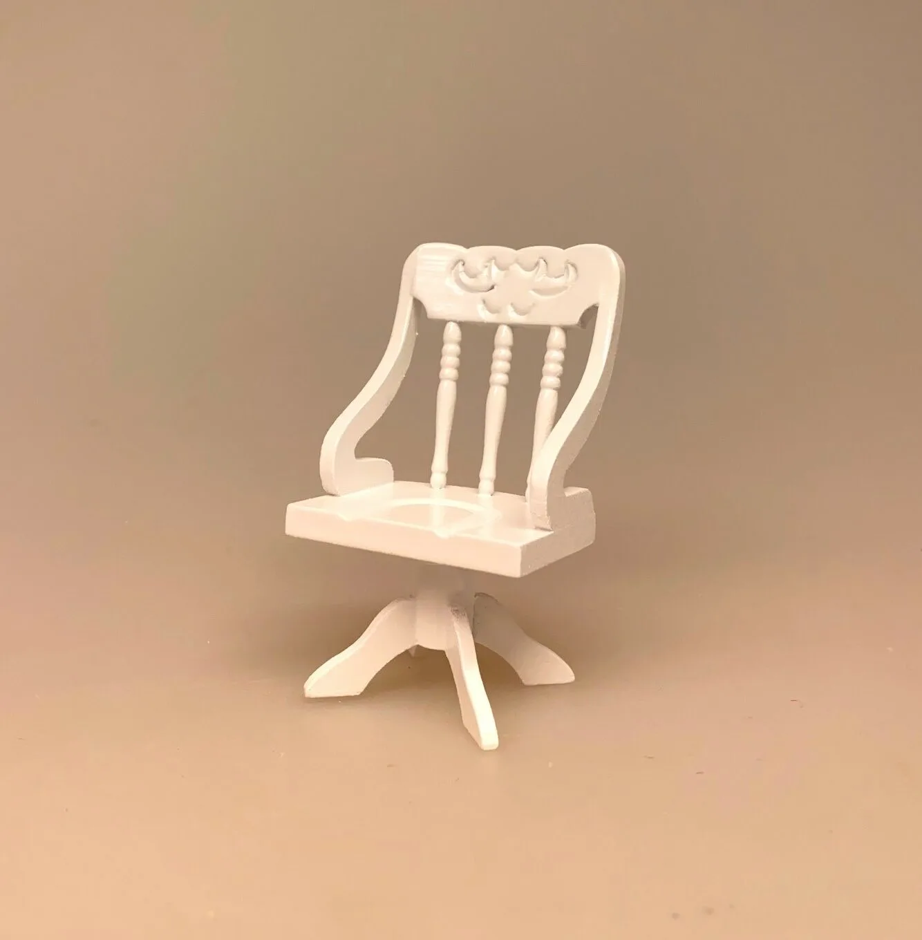 Enkel og veludført hvid drejestol af træ i dukkehus størrelse. Kontorstolen her er en klassisk model helt i træ. Modellen er komfortabel med armlæn og høj ryg. Som en klassisk kontorstol er understellet en firfod centreret under sædet, for god benplads. Stolen er smukt lavet med drejede detaljer og udskåret mønster på stykket øverst.