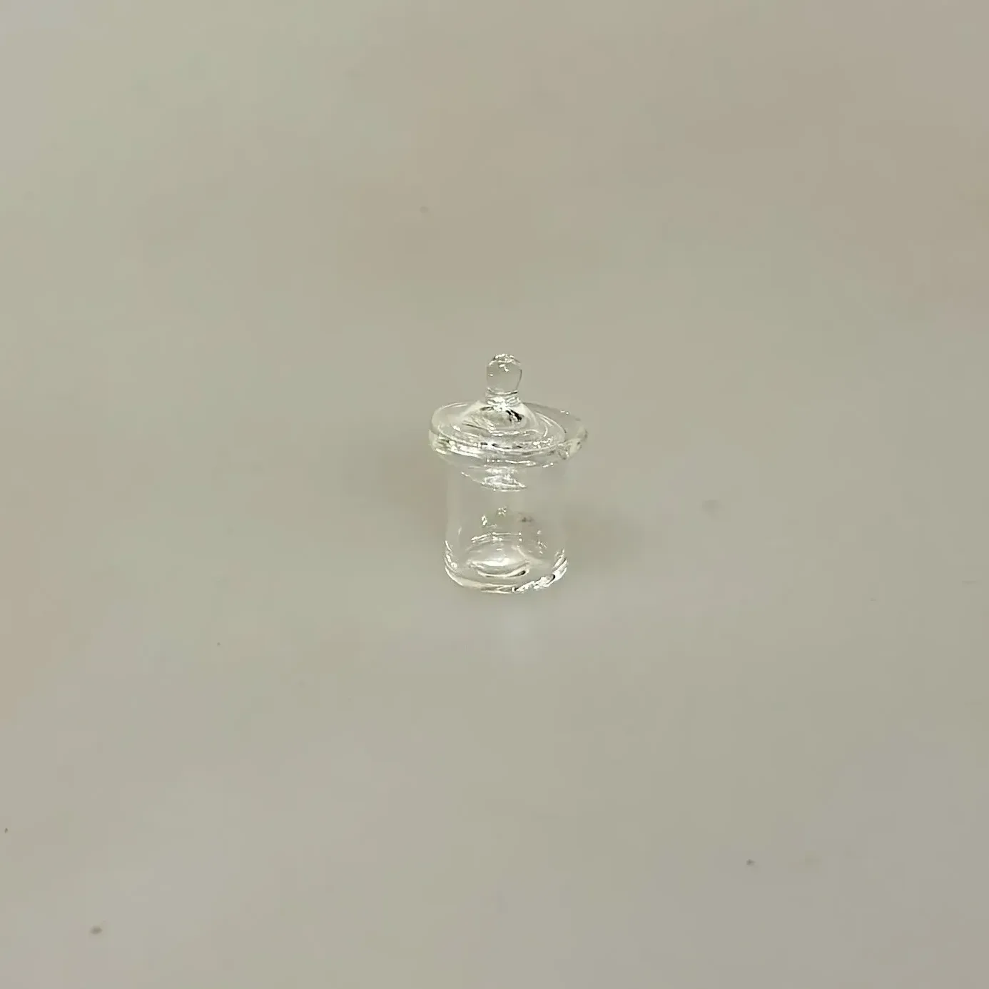 Flot håndlavet mini krukke af rigtig glas til f.eks. apotek, læge eller laboratorium. Det lillebitte klare pilleglas er mundblæst og har tilhørende låg med knop. Det er dekorativt i sig selv, og kan fyldes med piller i form af krymmelkugler eller andet efter eget valg.
