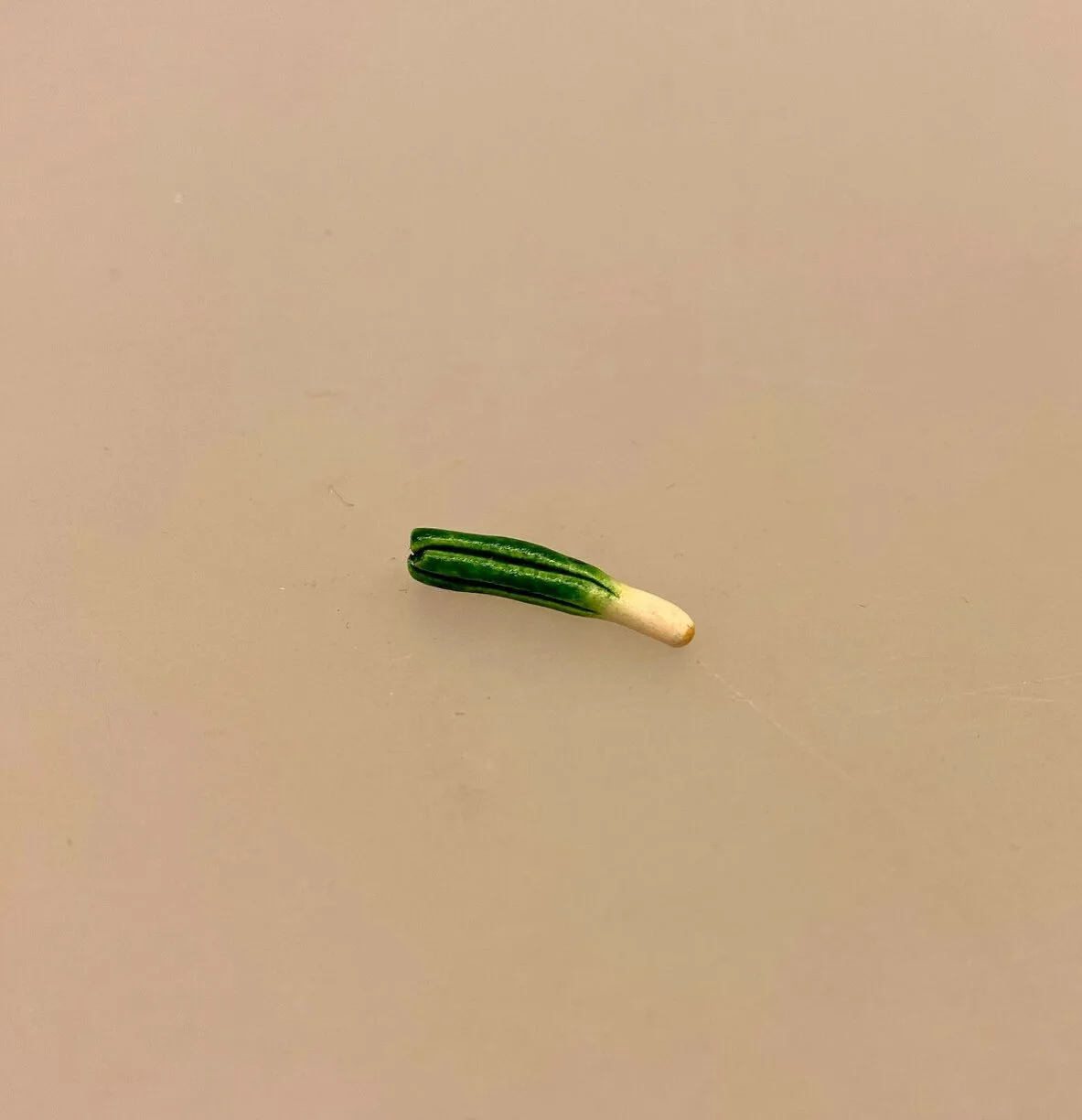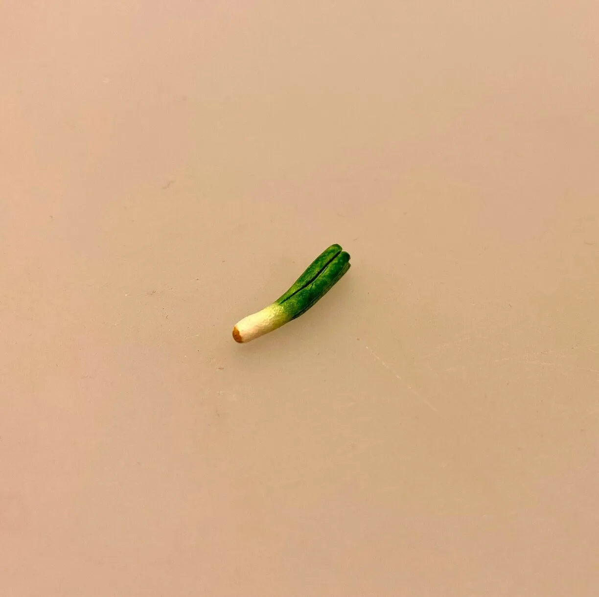 Herlig håndlavet lillebitte porre, der er et stykke imponerende håndarbejde. Hver eneste grøntsag er modelleret og udført i hånden, hvorefter den er håndmalet i de helt rette farver. Porren med den hvide bund, der toner over i mørkere grøn mod toppen. Grøntsagerne er alle forskellige og ser lækre og friske ud.