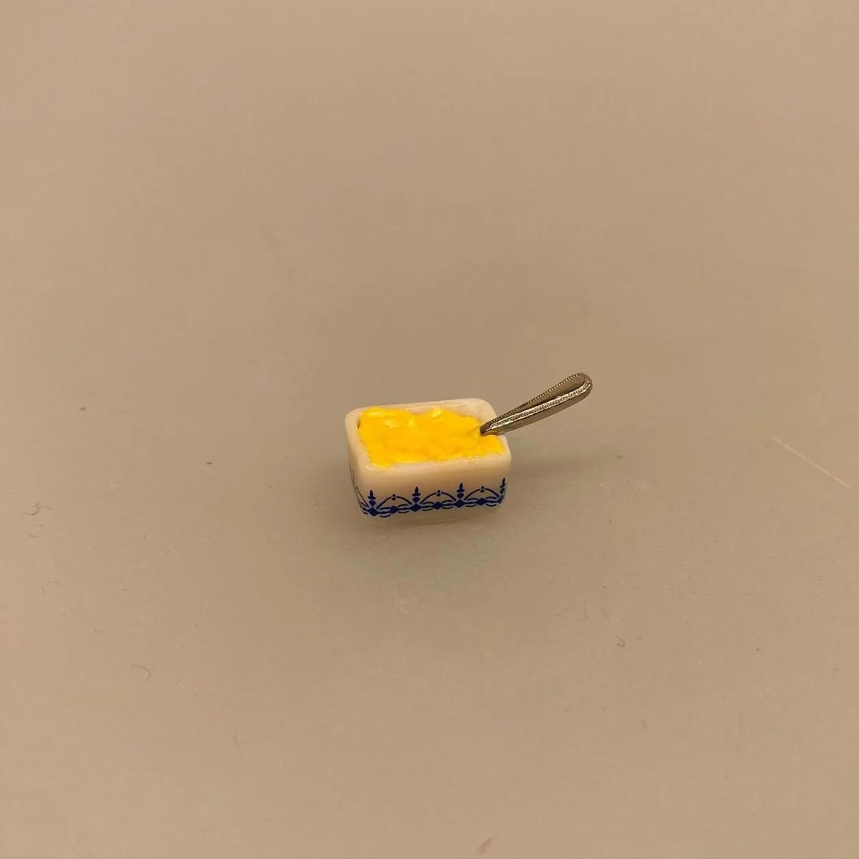 Sjov og fin smørskål til dukkehuset. Den passer perfekt ind i køkkenet, i spisestuen eller i stuen. Smør er jo et vigtigt, næsten uundværligt element på morgen- eller frokostbordet.