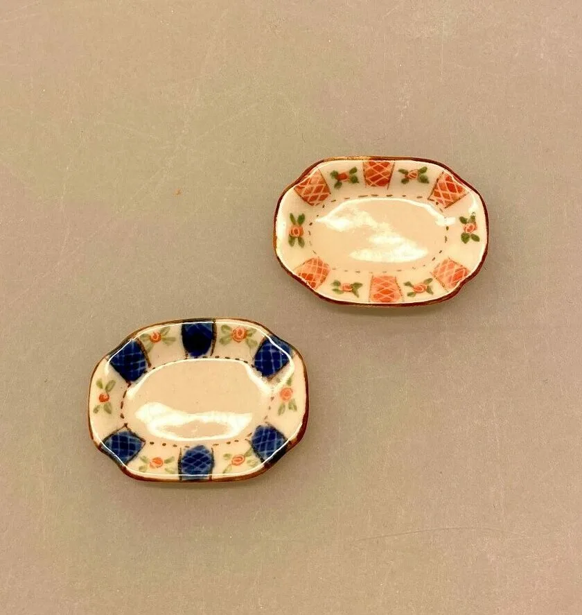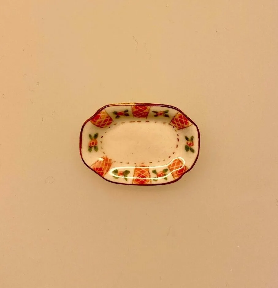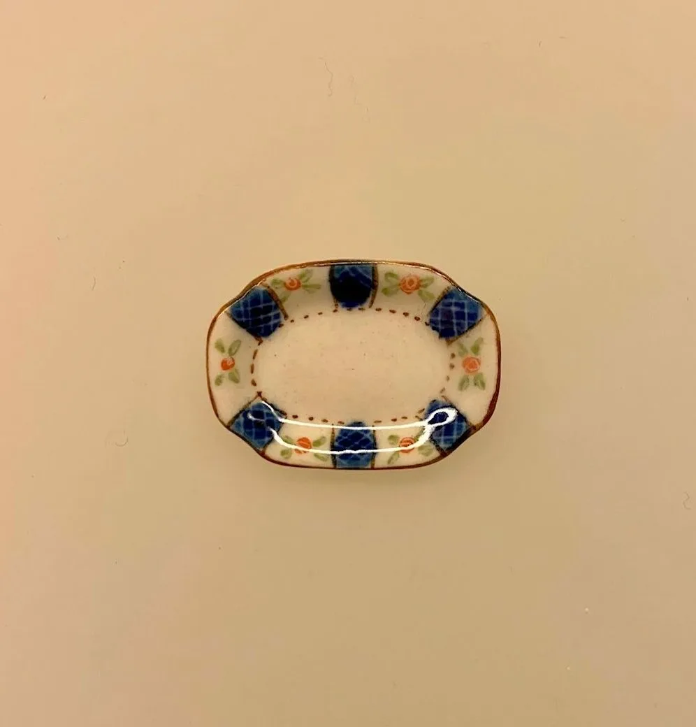 Yndigt lille fad hvid porcelæn med bemaling. Serveringsfadet er håndmalet og dekoreret med bittesmå roser og kulørte felter med ternet detalje. Fadet er anvendeligt i mange scenarier, og kan bruges i stue, køkken eller restaurant eller cafe. Det er dekorativt i sig selv, på væggen, på en hylde eller på et bord i stuen, gerne med kager eller mad. Man kan også lægge æg, frugt eller andet på det.