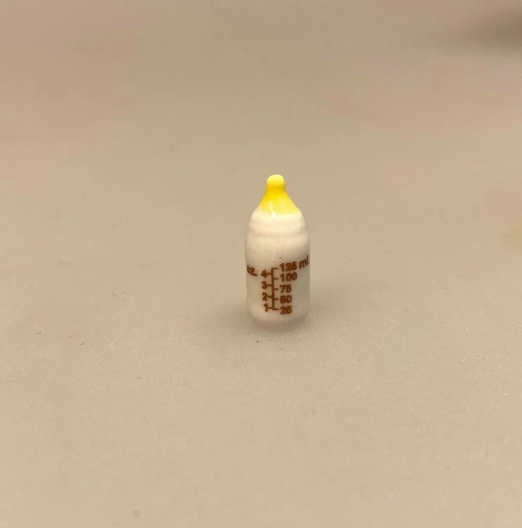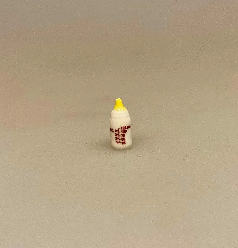 Kæreste lille mælkeflaske til de mindste beboere i dukkehuset. Sutteflasken er lavet af porcelæn og håndmalet. Miniature flasken er mælkehvid med gul sut og på flasken står bitte bittesmå tal, der angiver mængden af væske.