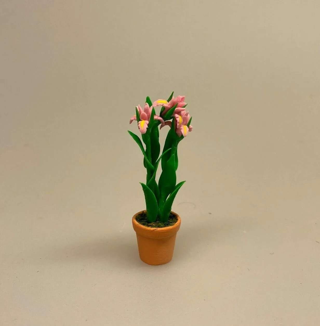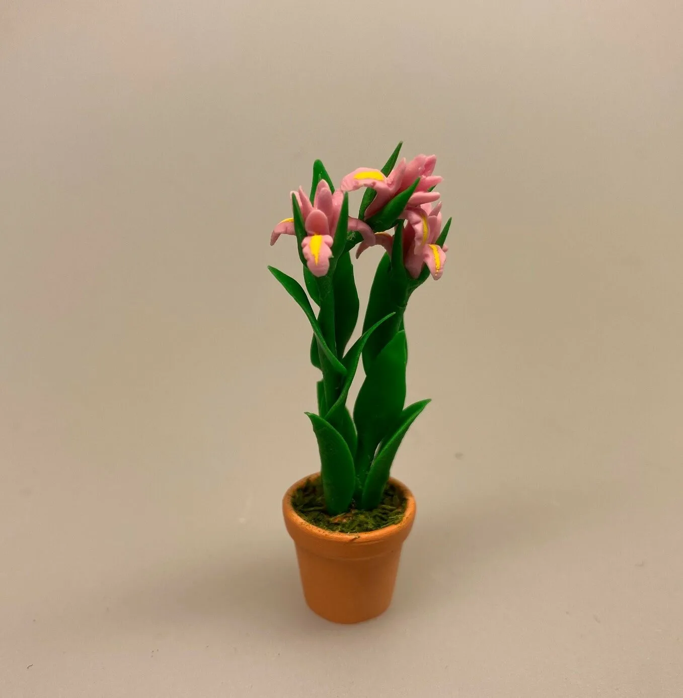 Sød lille forårsblomst. Urtepotten er en klassisk rødbrun lerpotte. Den runde urtepotte er fuld af fine håndlavede mini Iris. Blomsterne er bittesmå og gennemført med imponerende detalje rigdom.