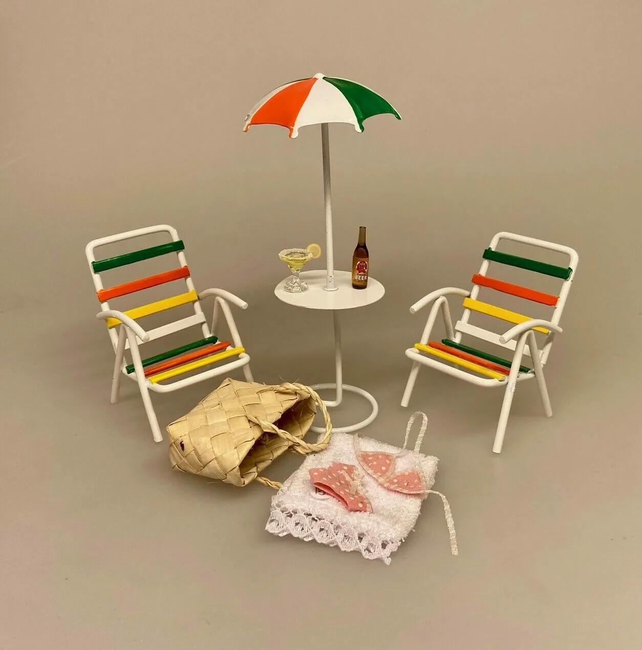 Sættet er sjovt i dukkehusets have eller på en strand med sand, muslinger og krabber. Det kan styles med blomster, solhat, avis og læsebriller eller håndklæde, sodavand/dåseøl og badetøj osv.
