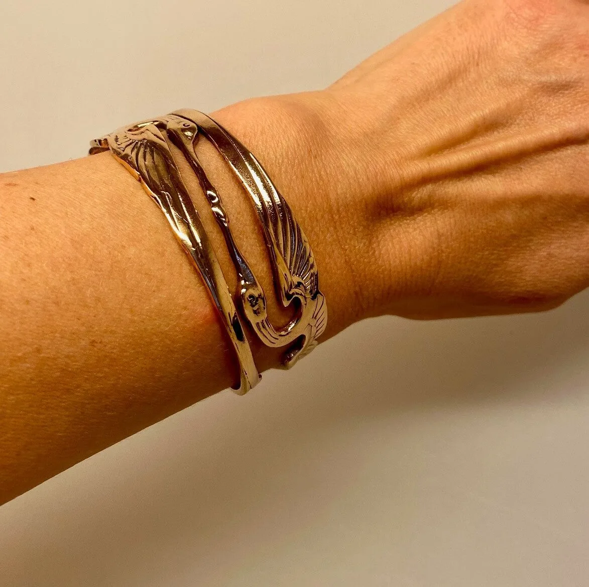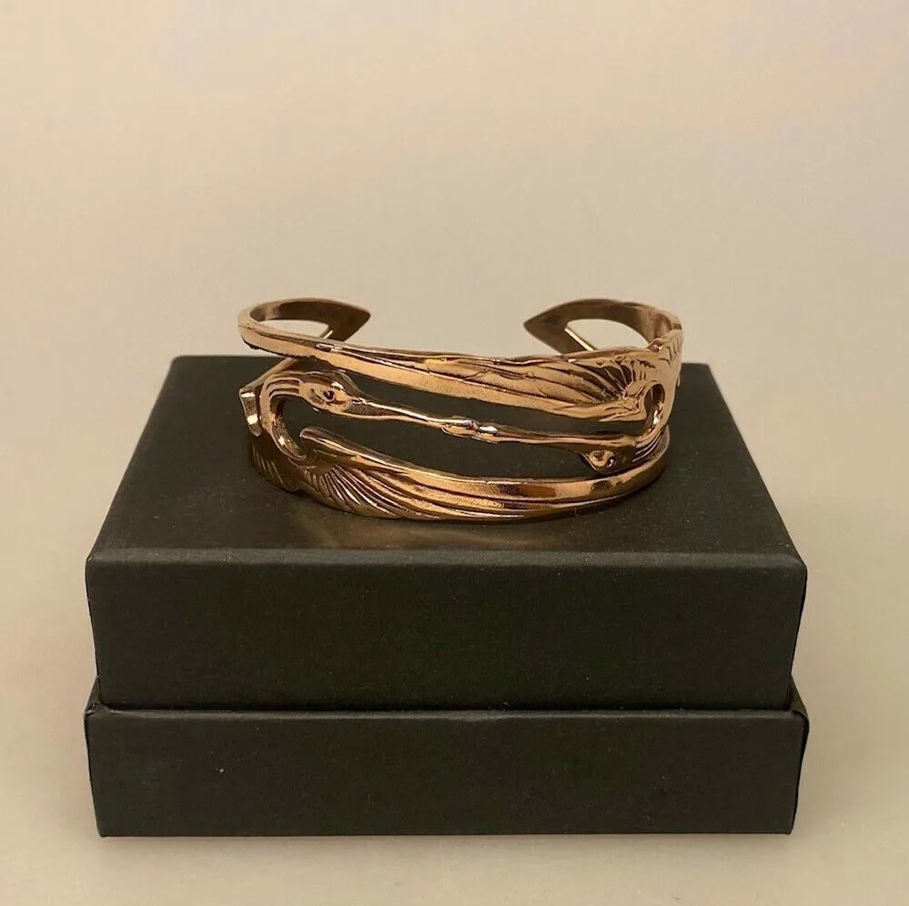 Flot kraftig armring i bronze udsmykket med to kærlighedsfugle. Armringen består af to fugle – svaner, storke eller traner med udbredte vinger og lange næb, der mødes i et kys. Armbåndet er lækkert forarbejdet med en halvoxydering, der fremhæver det fine mønster. Armbåndet er bredt og har en god tyngde. Armringens motiv er gennembrudt og virker således let.