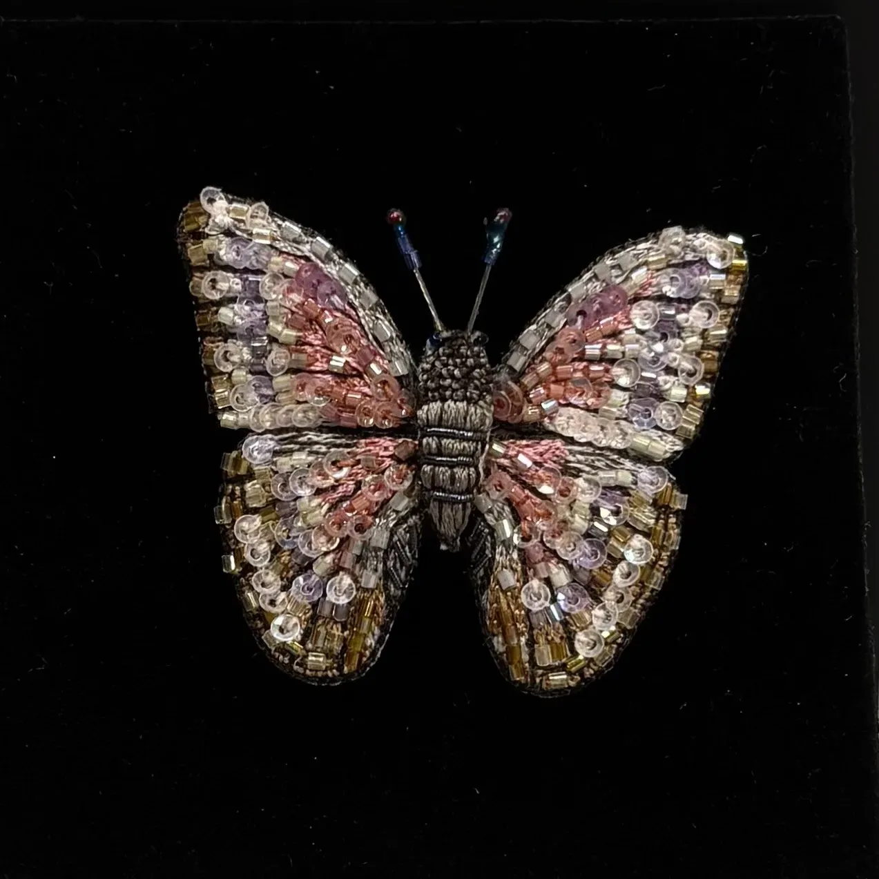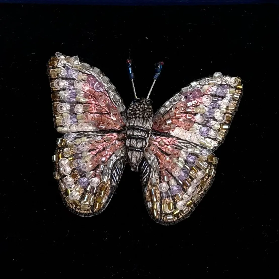 Brochen her er et helt fantastisk lille kunstværk. Hver enkelt smykke er håndgjort og lækkert udført. Sommerfuglen er håndbroderet med bittesmå sting og forskellige sy-teknikker. Som en ekstra finesse er den endelig dekoreret med små pailletter og cylinderformede perler, seabeeds, der fanger lyset og tilfører insektet liv og magi. Denne fantastiske sommerfuglebroche er udført i underspillede dæmpede farver – østers beige, rosa og violet med detaljer i perlemor og mulvarpe brunt. Resultatet er delikat og elegant. Dæmpede nuancer og en blød pelset krop.