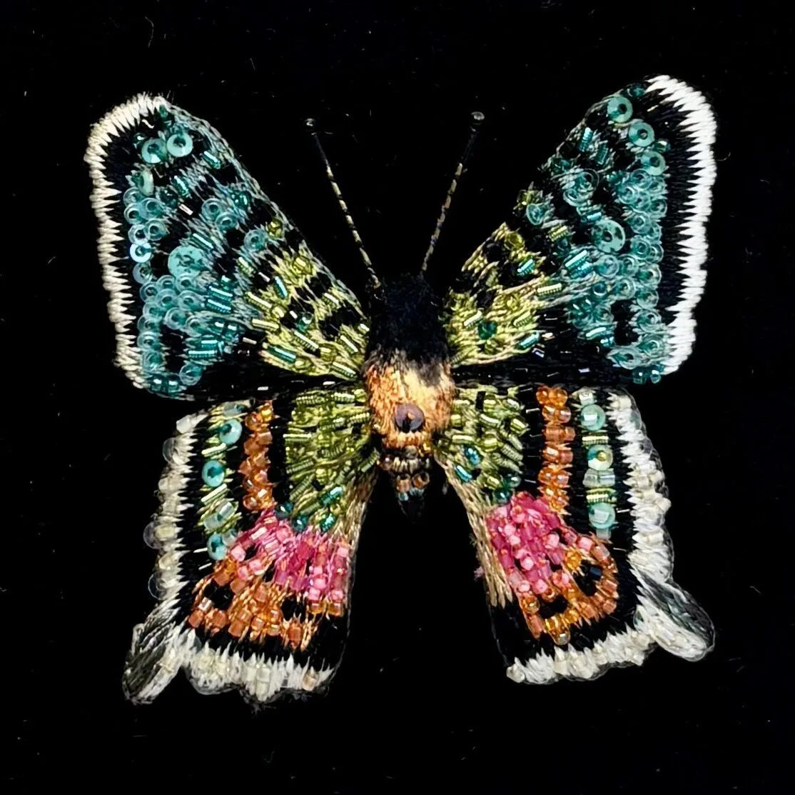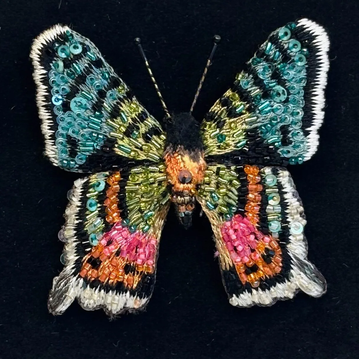 Brochen her er et helt lille kunstværk. Hver enkelt smykke er håndgjort og lækkert udført. Sommerfuglen her er håndbroderet med bittesmå sting og forskellige sy-teknikker. Som en ekstra finesse er den endelig dekoreret med forskellige små perler, sten, pailletter og seabeeds, der fanger lyset og tilfører insektet liv og magi. Sommerfuglen her har det fineste farvespil i turkis, grønt, koral, samt pink. Det elegant farver.
