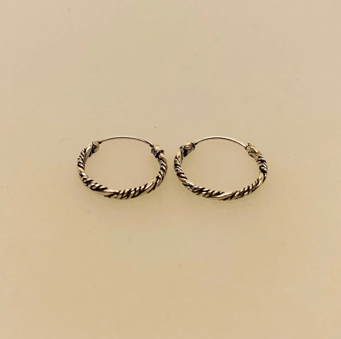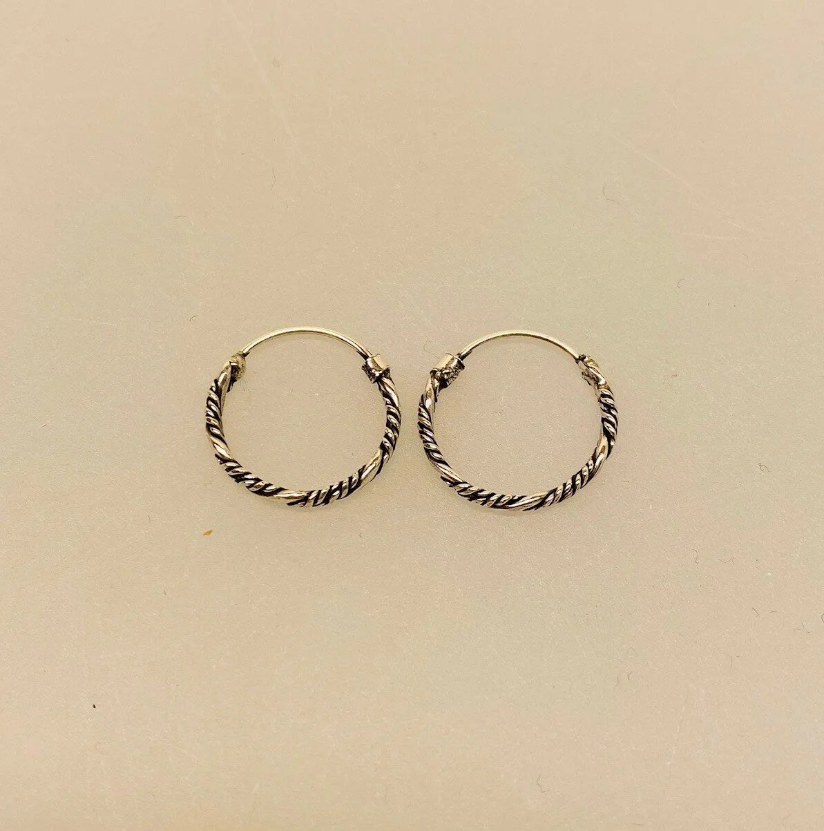 Smukke små og enkle hoops med et enkelt og diskret udtryk. Creolerne er lavet som en rund ring af to snoede sølvbånd – en glat sølvtråd og en snoet let oxideret sølvtråd, som efterfølgende er gjort fladere.