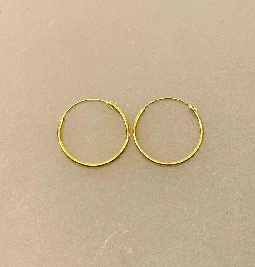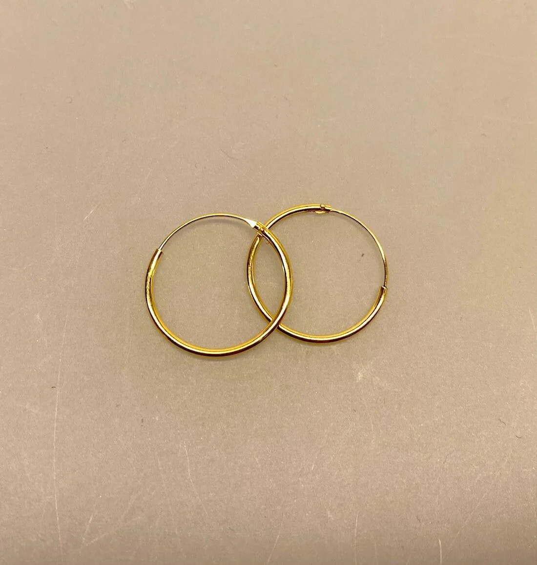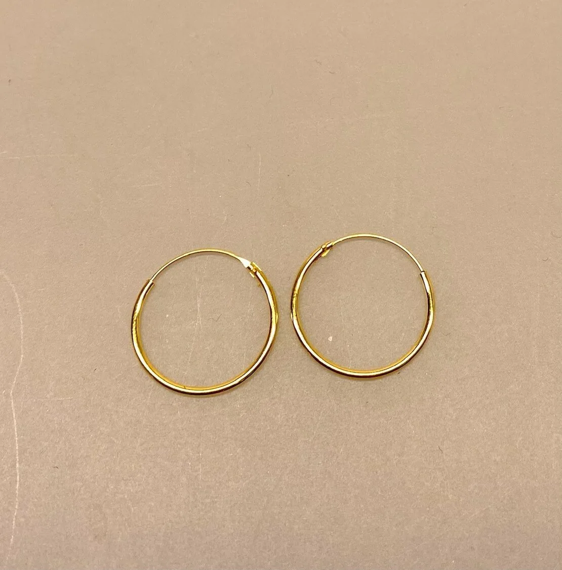 Smukke “hoops” – runde creol øreringe i guld. Ørenringe af ægte sterling sølv, der er guldbelagt. Disse er enkle og tynde, størrelsen er en moderat hverdagsstørrelse.