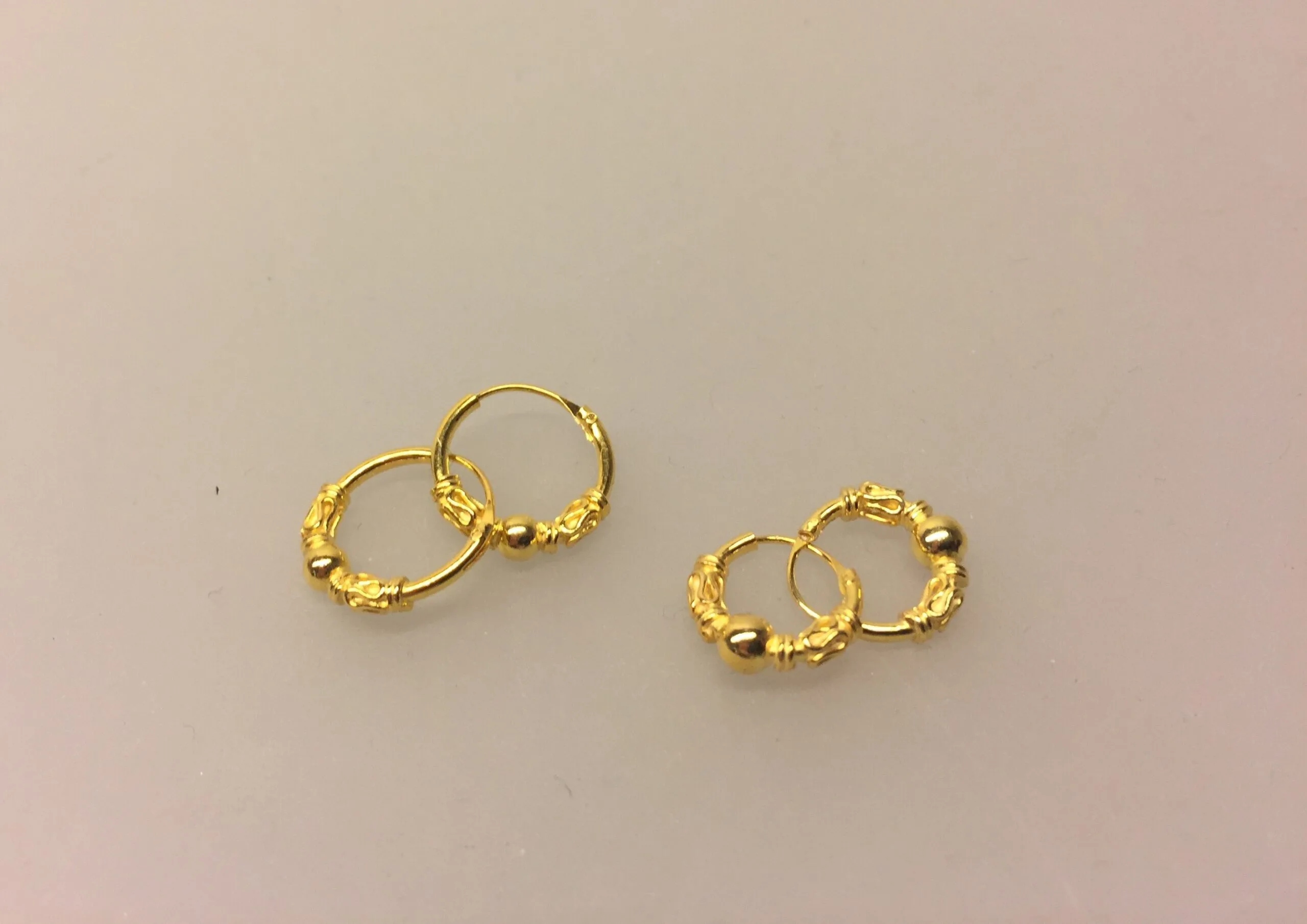 Creolerne her er små og fine. De har nederst en gylden kugle, med S-mønster på hver side.