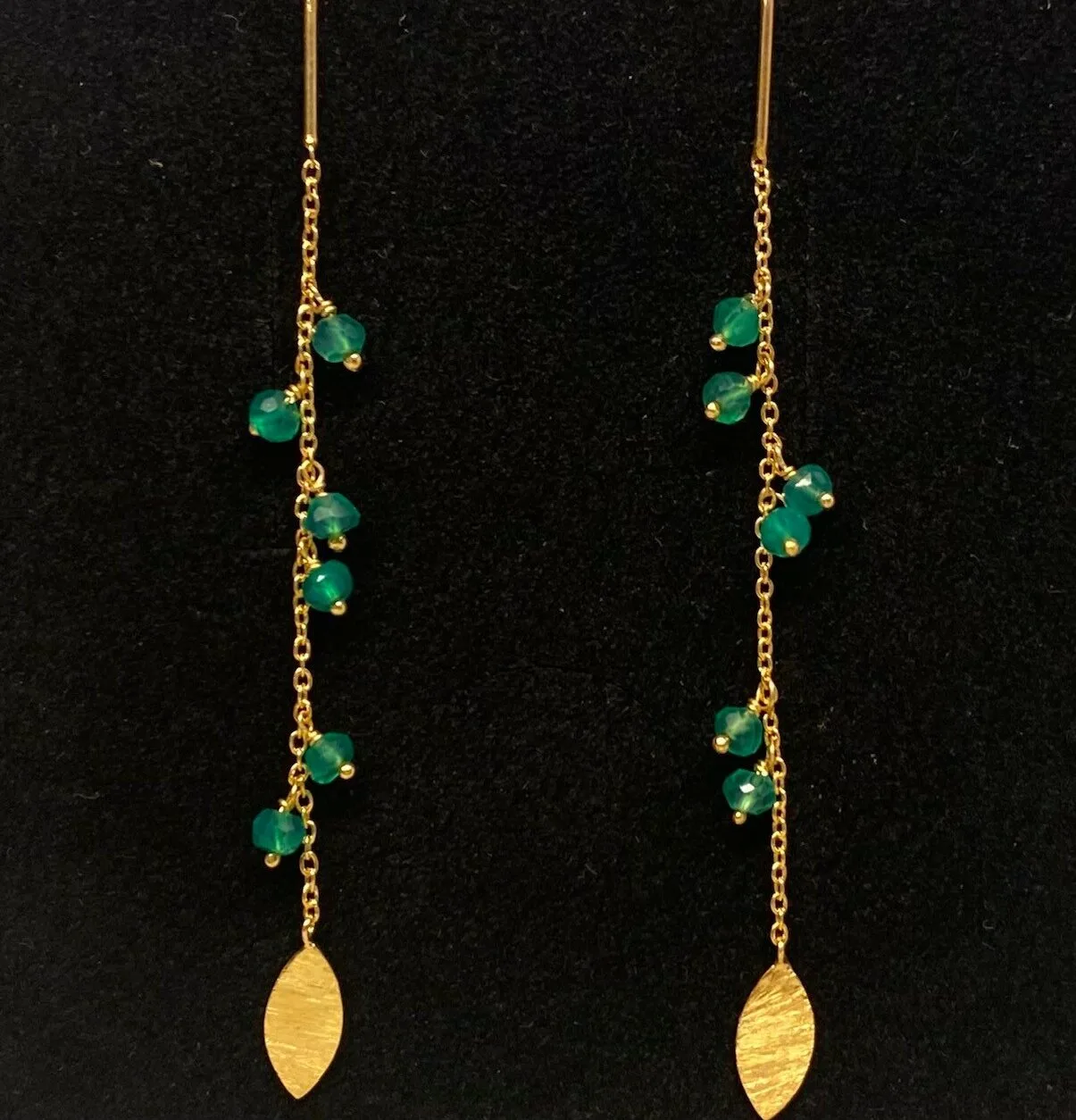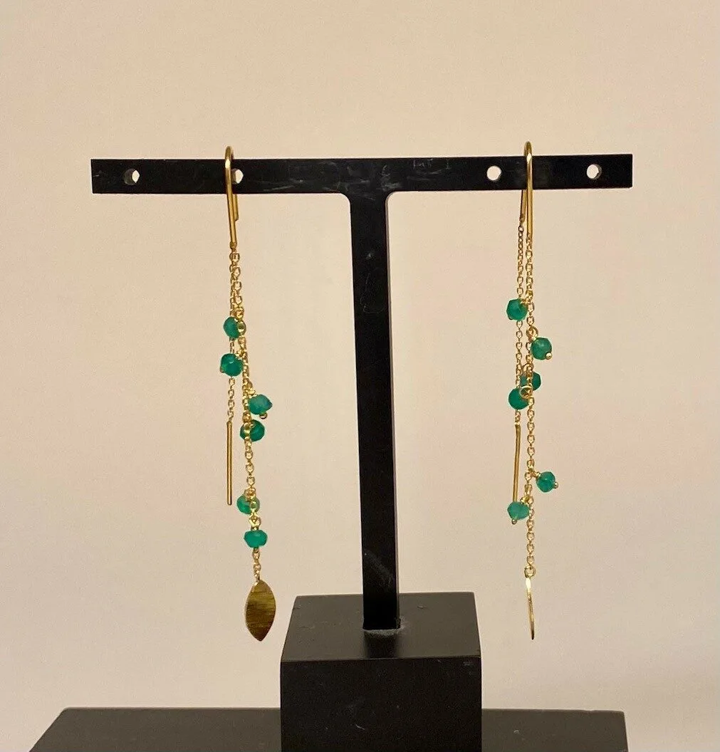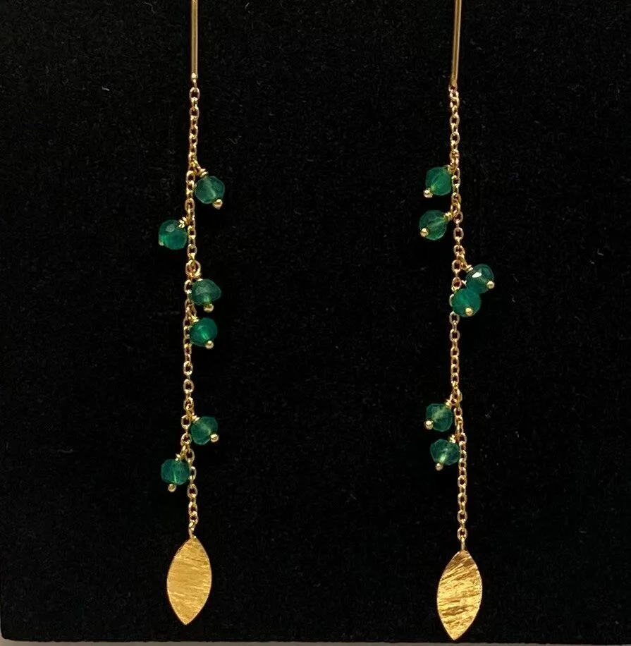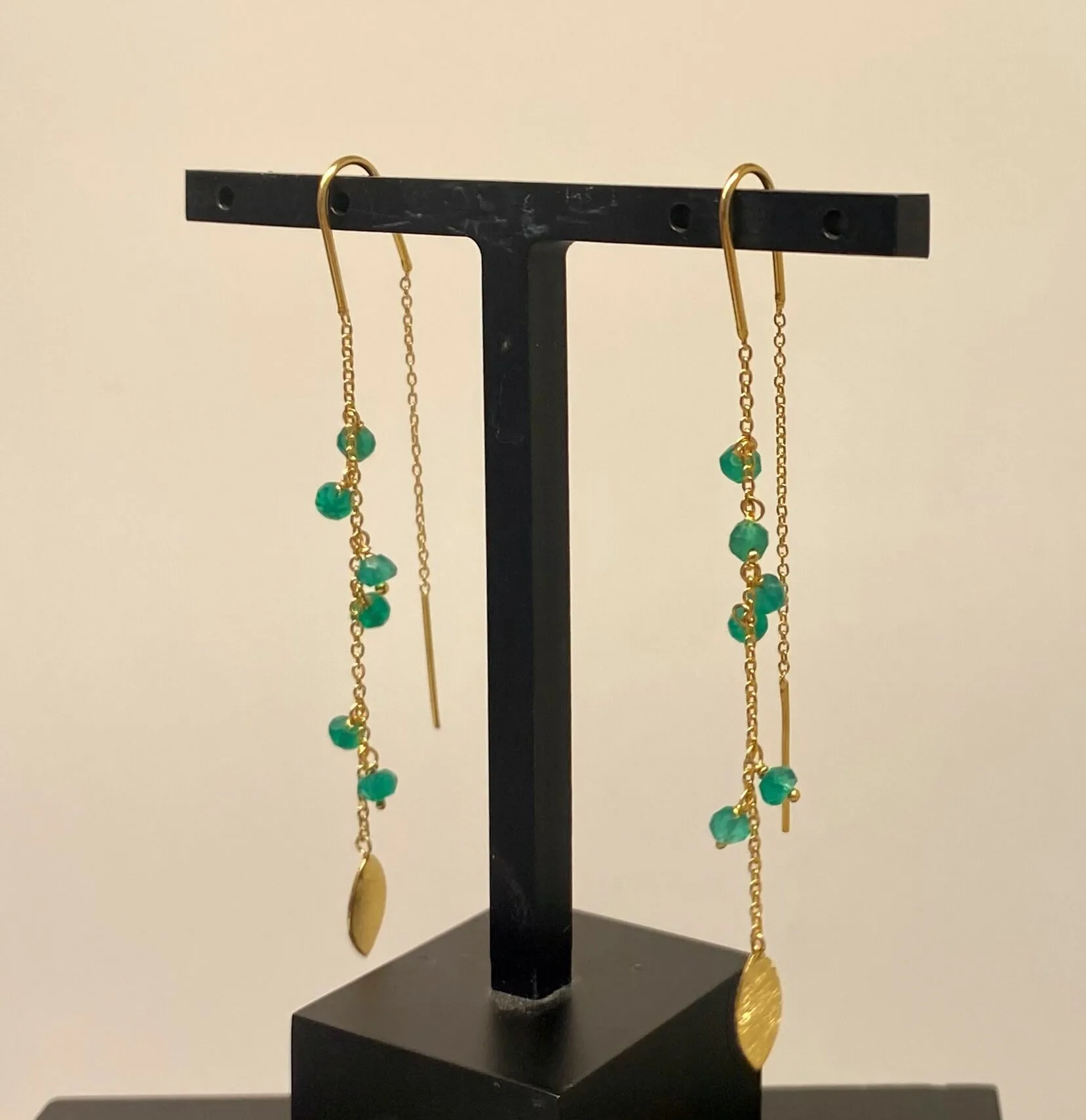 Flotte gyldne ørenringe med ægte sten og et elegant udtryk. Ørehængerne består af en lille bue, der går igennem flippen. På begge sider hænger en slank guldkæde. Den bag øret ender i en glat guld pind. Den forreste kæde ender i et fint guld blad. Langs kæden hænger 7 smukke små ægte ædelsten – grønne agater. Ørenringene er smukke og kan både bæres til et festligt outfit og løfte et hverdagslook op til noget særligt.