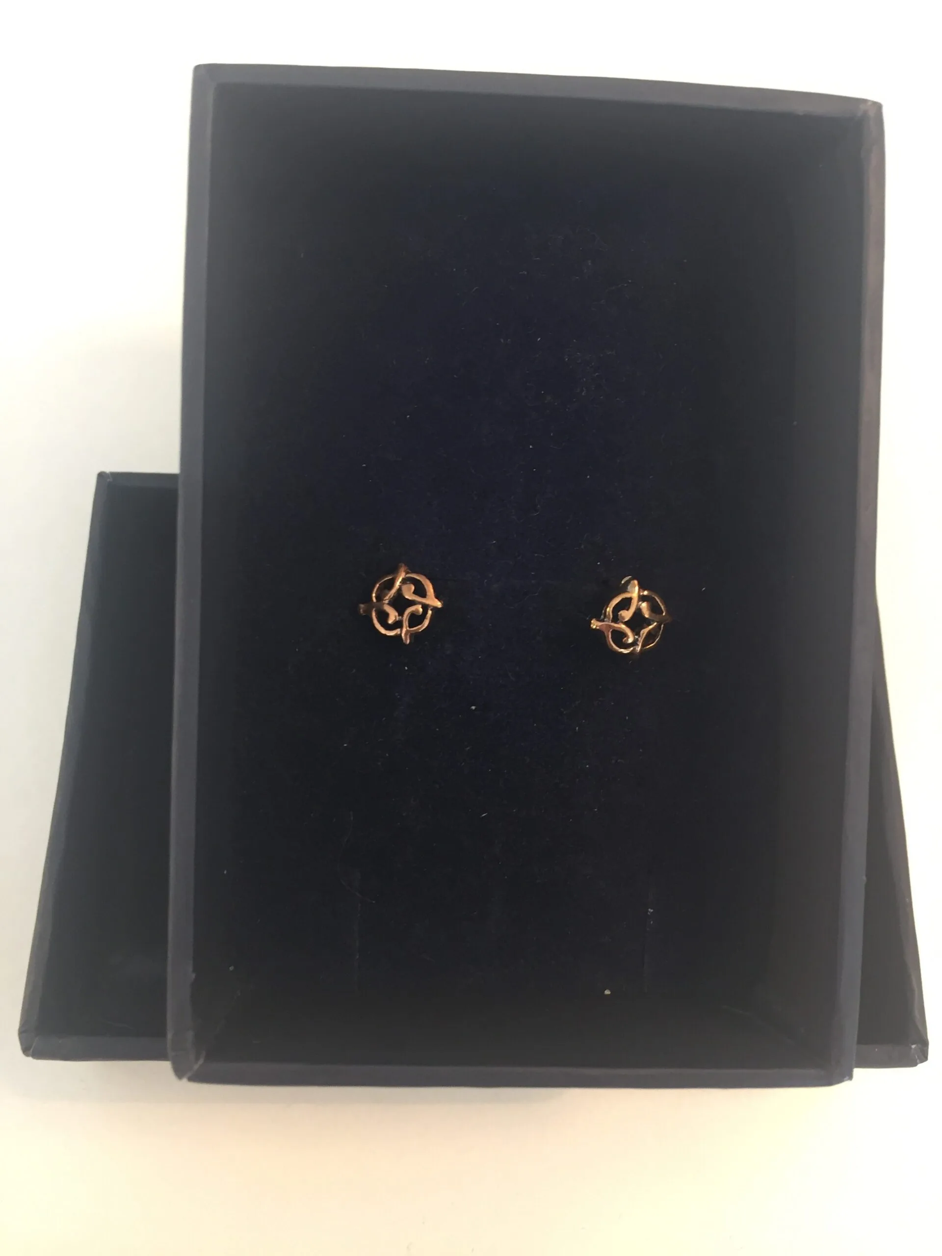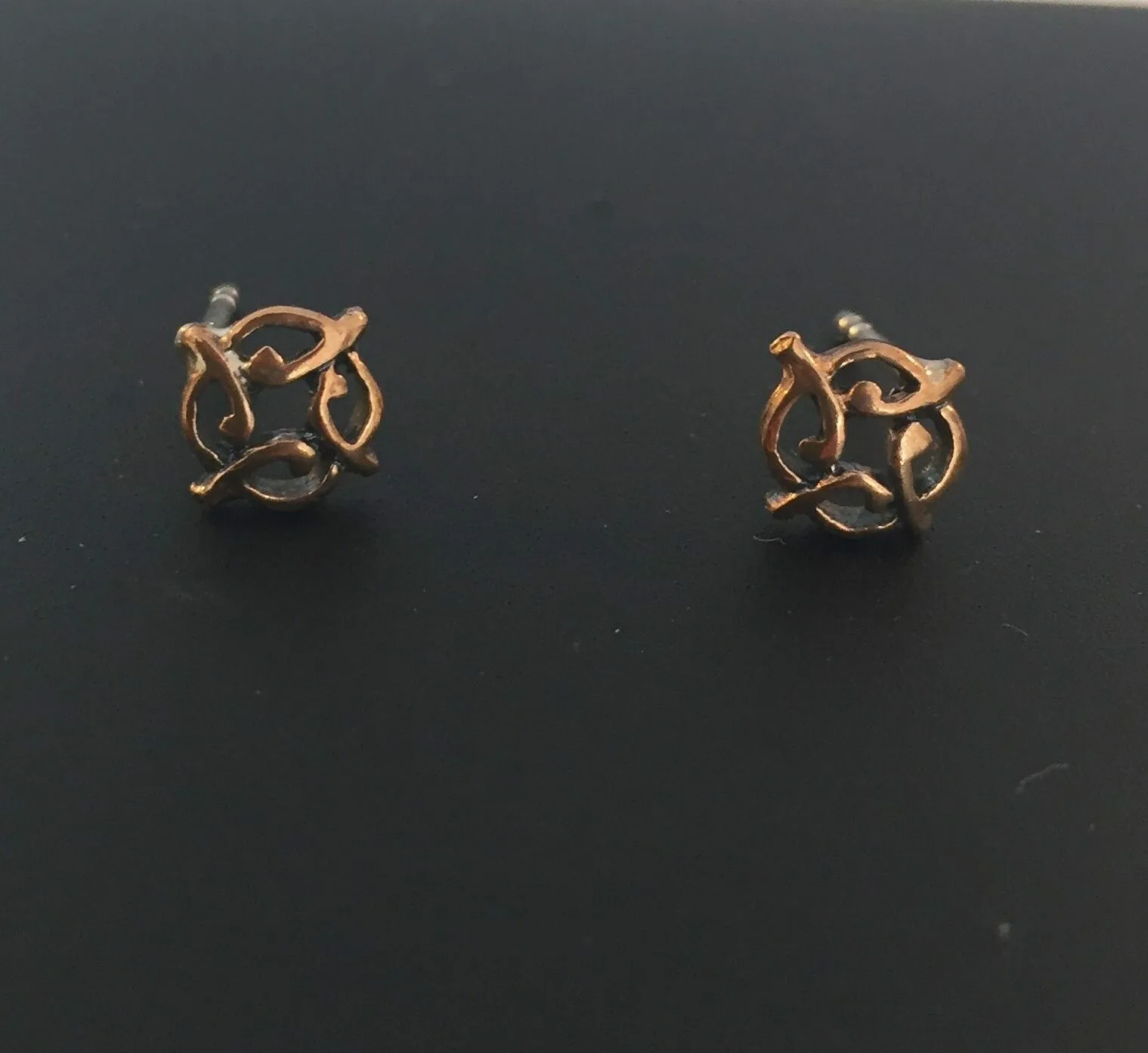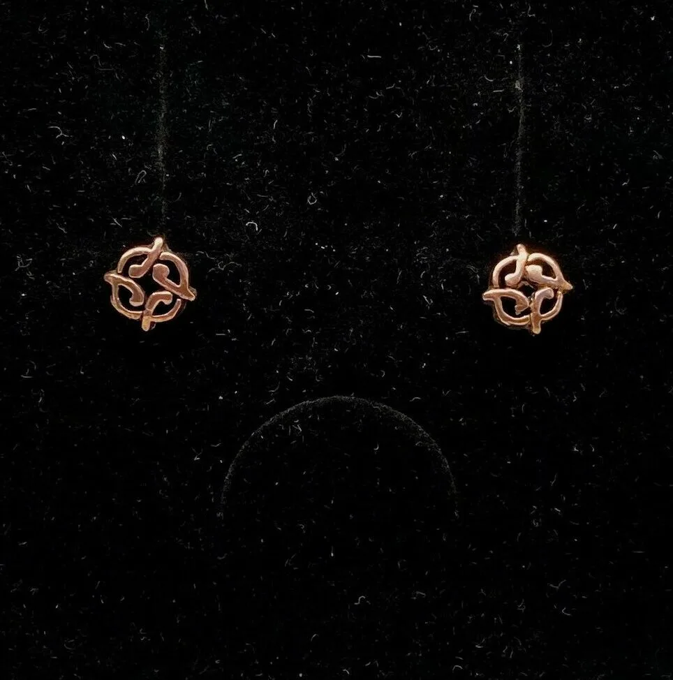 Flotte bronze studs med fint fletværk. Øreringene har en harmonisk facon, en lille knude dannet af fire flige. De fire dele peger i hver sin retning og står for de fire elementer og livets gang.