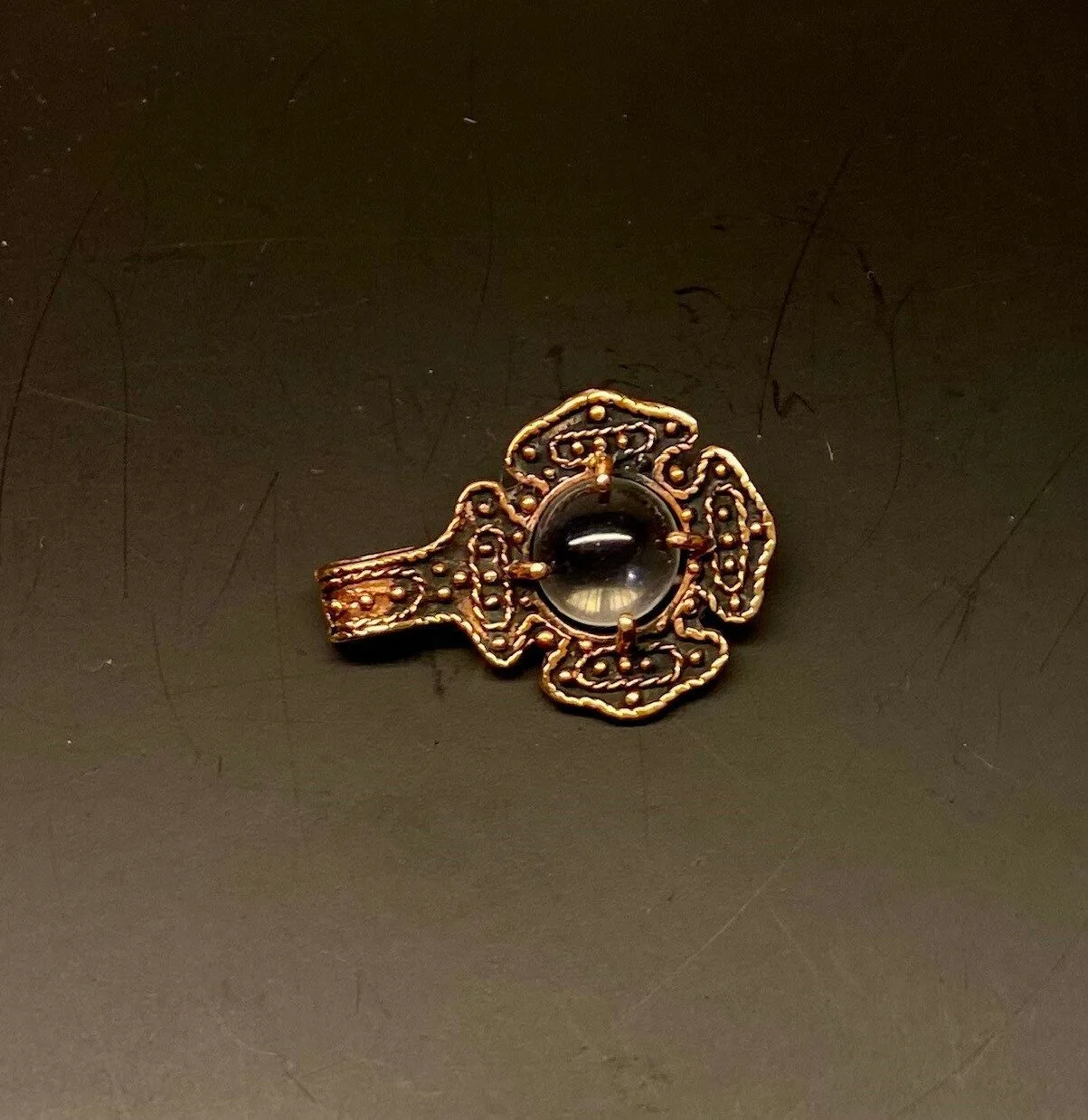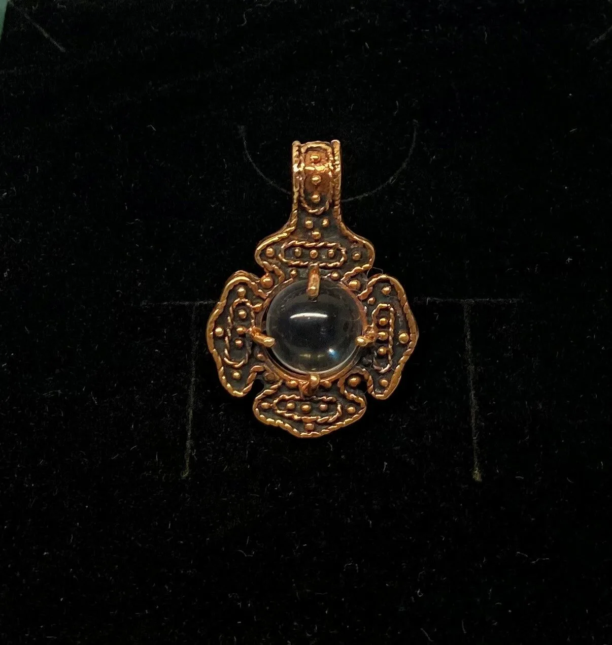 Smukt vikingevedhæng i bronze – med gotlandsk krystal, form som firkløver eller blomst.
