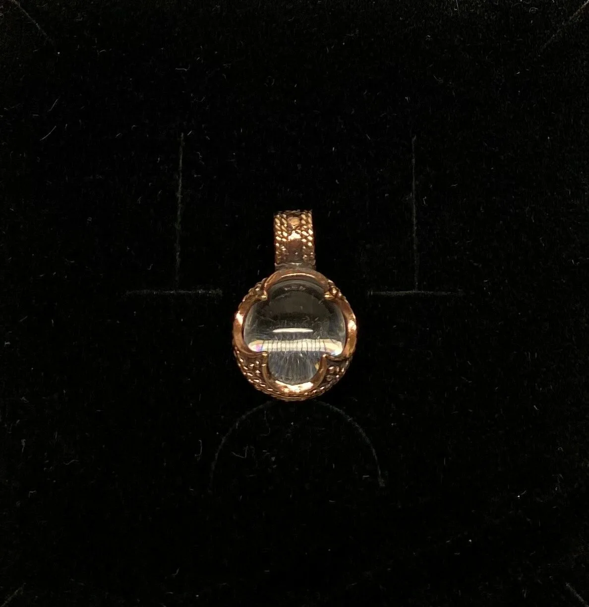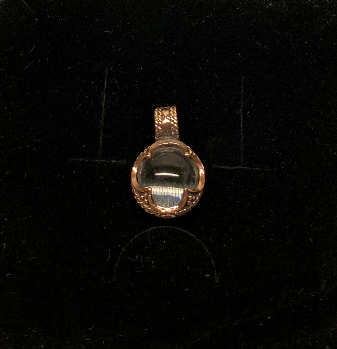 Det flotte vedhæng består af en klar bjergkrystalkugle indfattet i fint ornamenteret bronze.