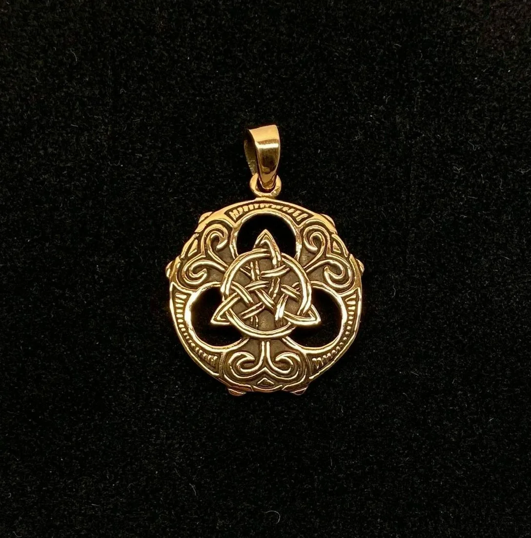 Bronze-vedhænget her er rundt og dekoreret med åbent fletværk og symboler. Det centrale element er en triskele, en trekant bestående af fletværk uden ender – et symbol på evigheden. Trekanten er omkranset af en cirkel. Symbolet i midten er flettet sammen med den yderste kant, så hele smykket hænger sammen, harmonisk og elegant.