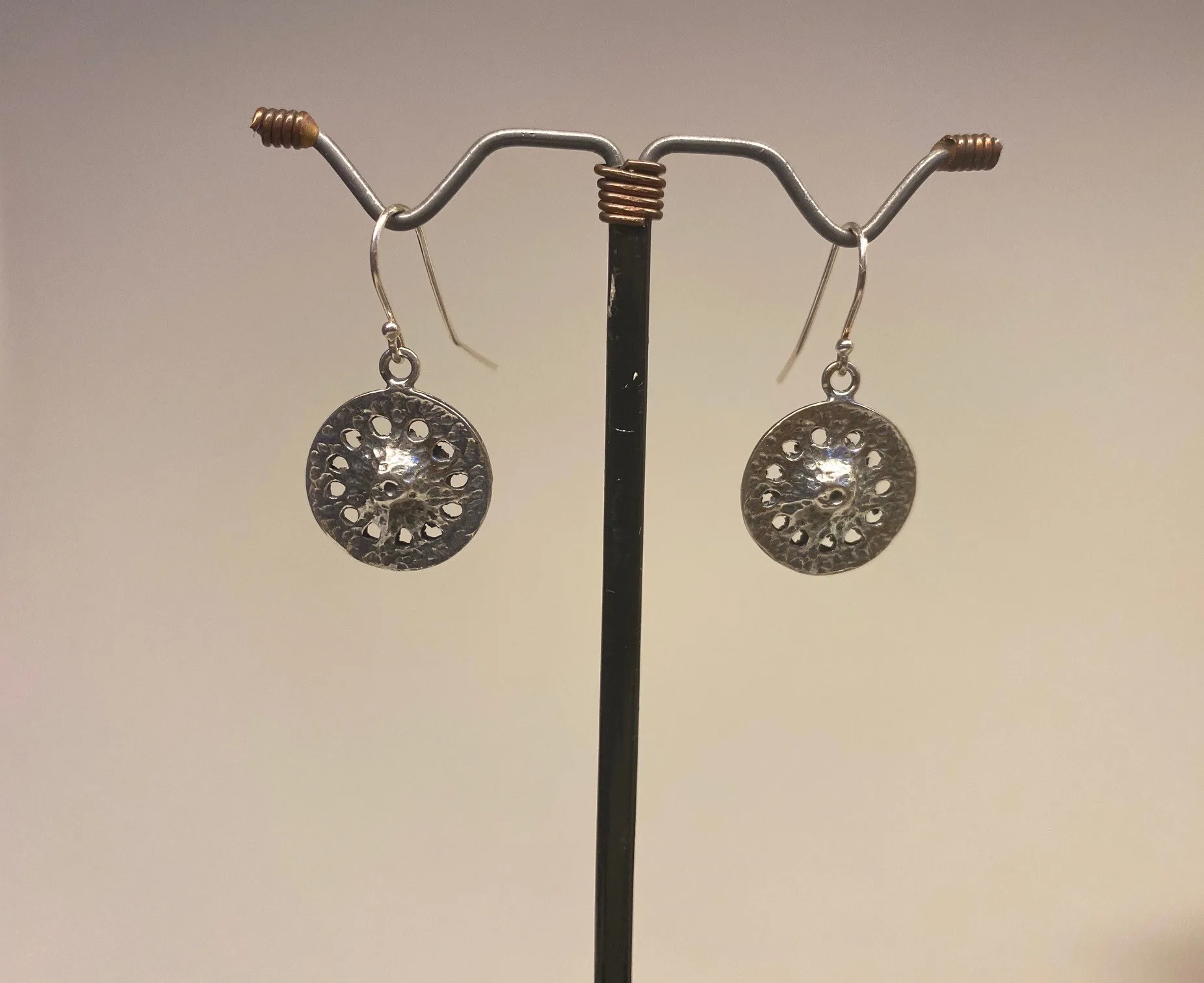 De runde sølv øreringe er enkle og elegante. Ørestikkerne består af en fin let banket plade, med en forhøjning i midten. Omkring denne er der 12 huller. De 12 huller symboliserer årets 12 måneder og den runde form viser tidens gang, der aldrig ender.