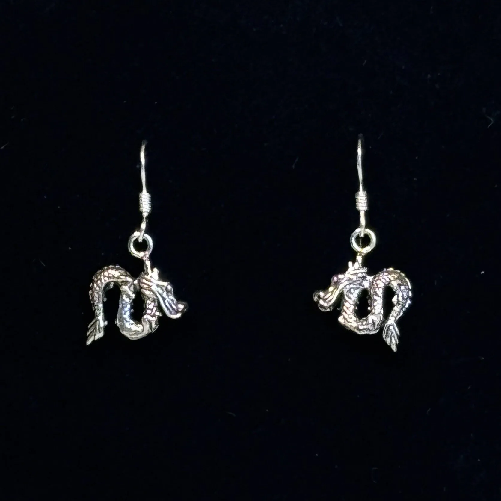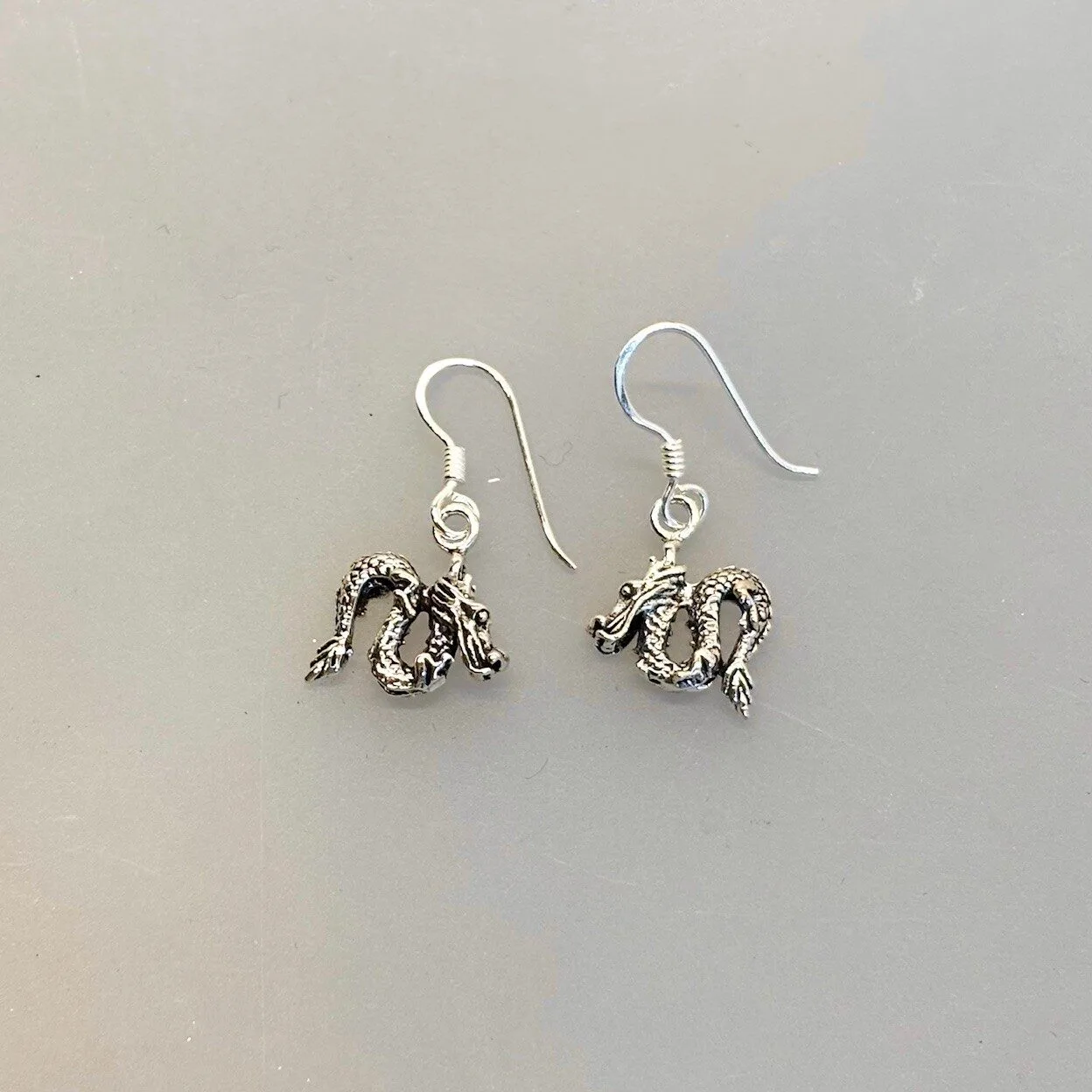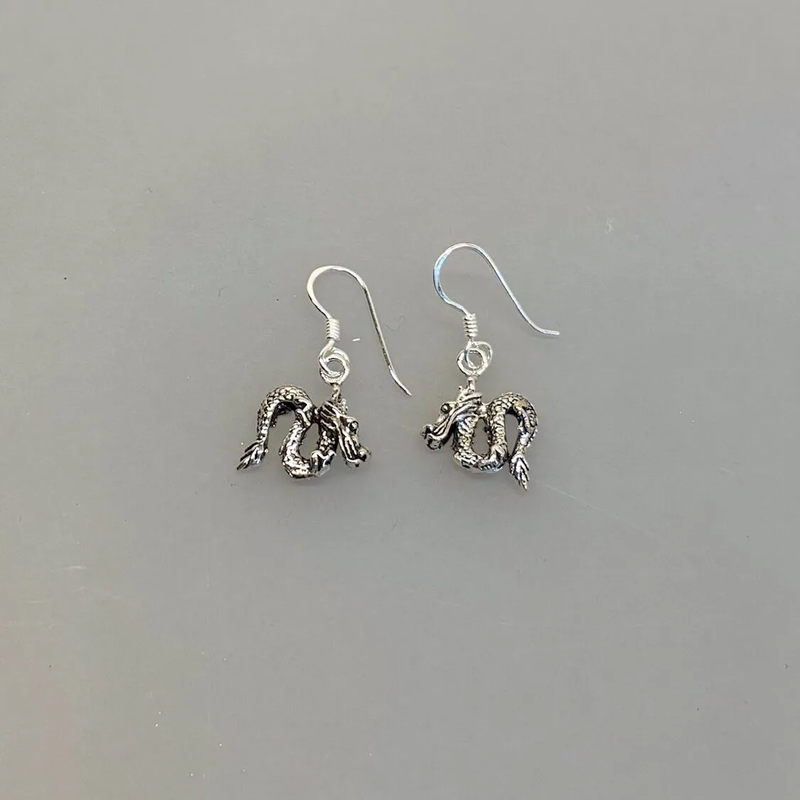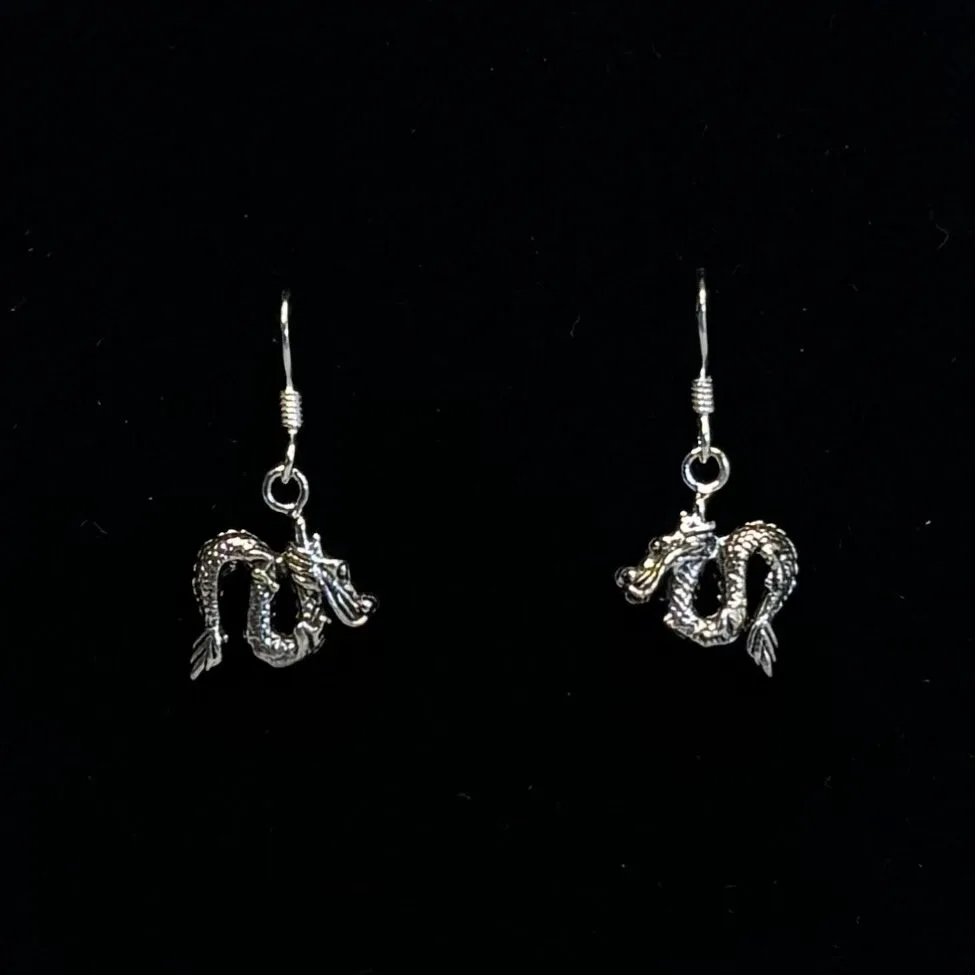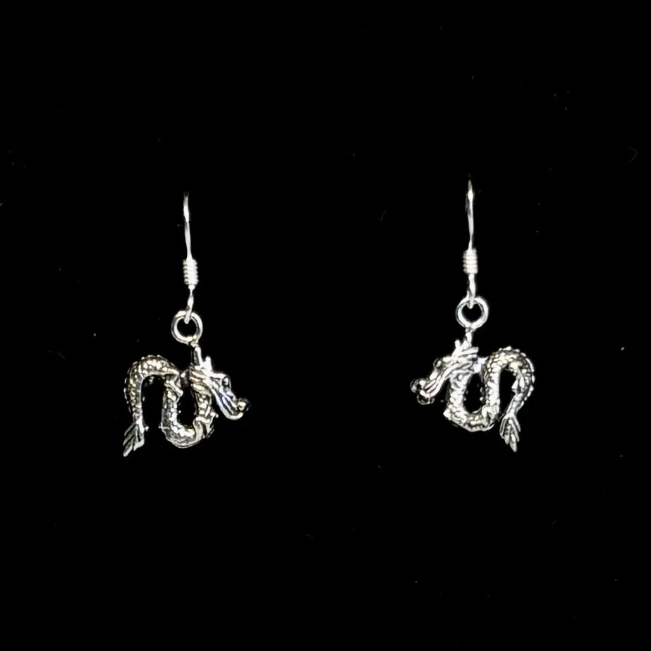 Fra en klassiske enkle sølvkroge hænger et par små svungne drager. Dragen slynger sig som et S og er sirligt udført med fine detaljer. Dragen har bittesmå skel, et dramatisk hoved og en kraftig halespids.