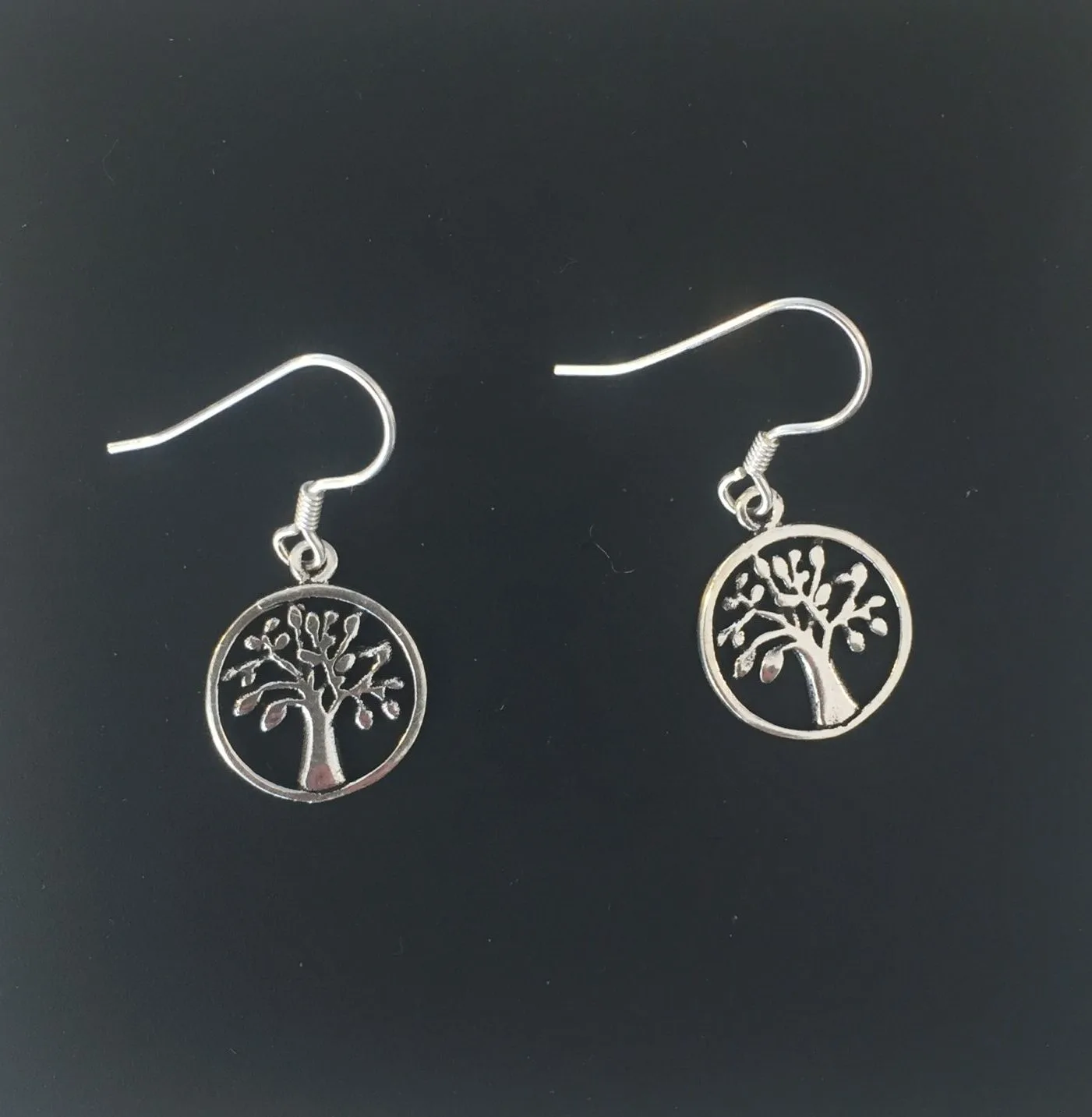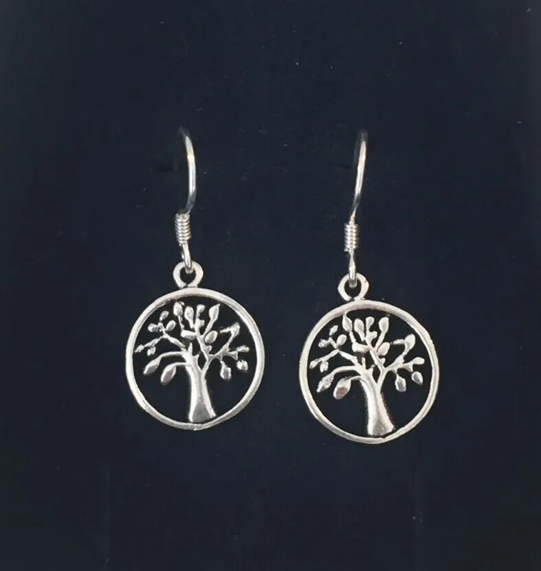 Fine sølv ørehængere med små runde vedhæng, der forestiller livets træ Yggdrasil.