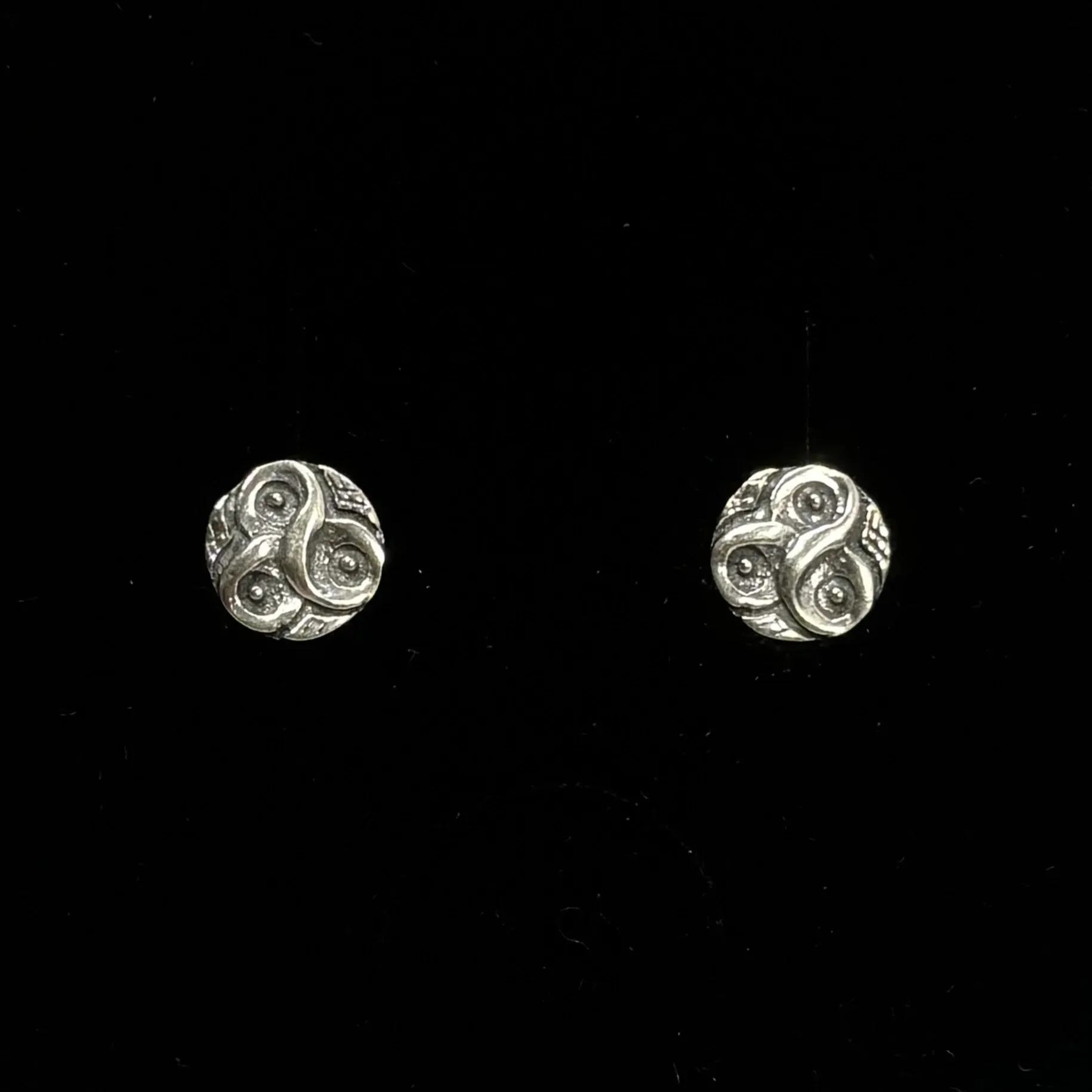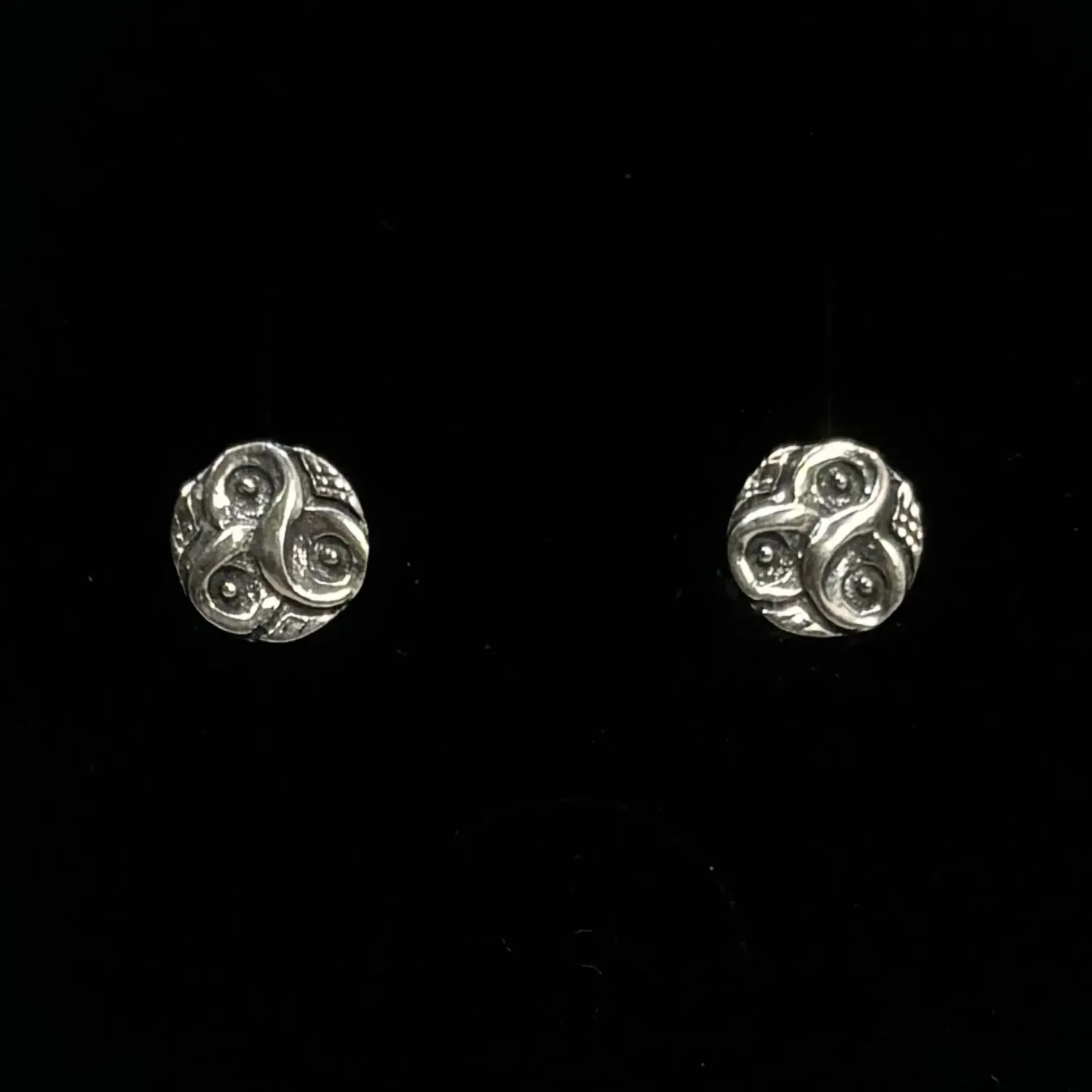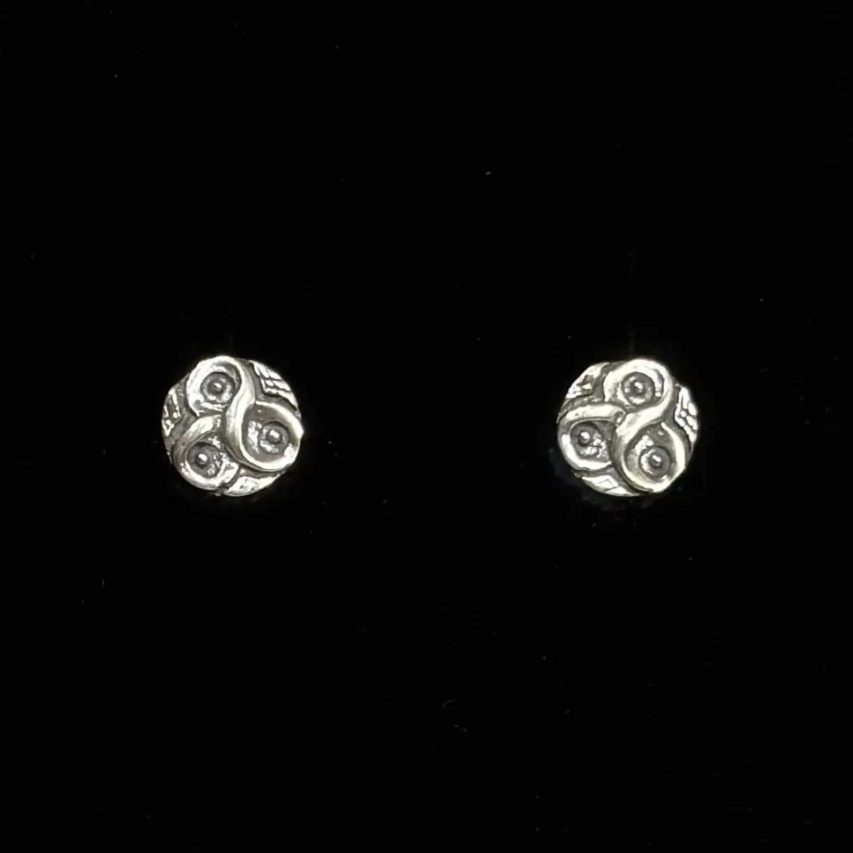 Fine små runde ørestikkere af sølv udsmykket med triskele