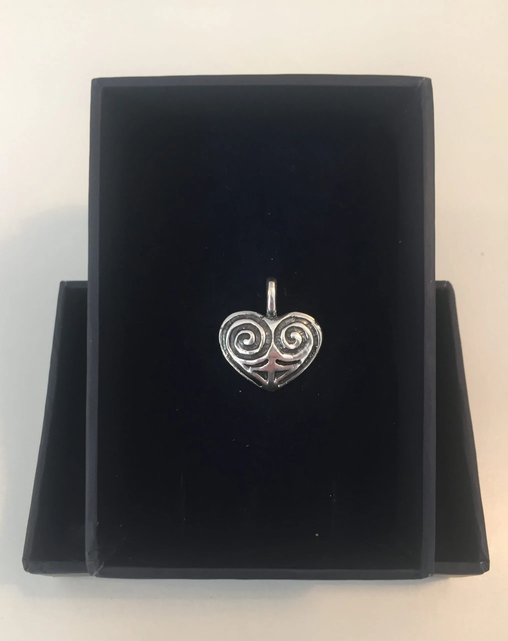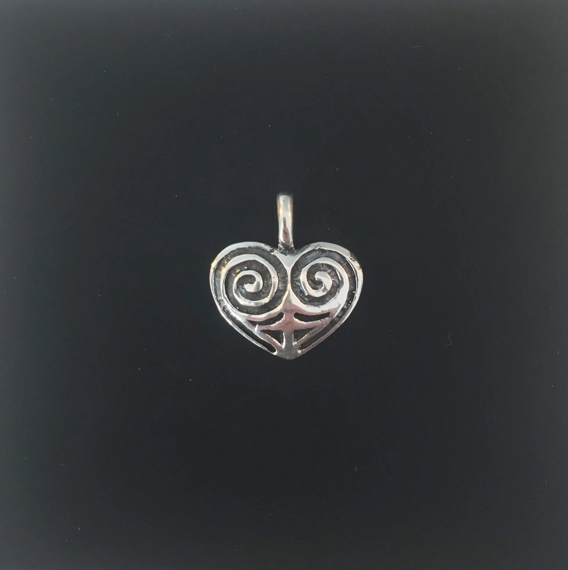 Amulet for kærlighed symboliseret ved hjerteformen og frugtbarhed, livskraft og fornyelse symboliseret af spiralerne.