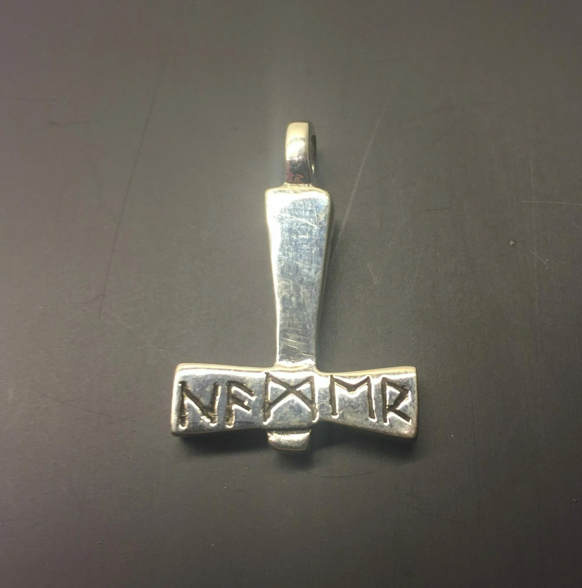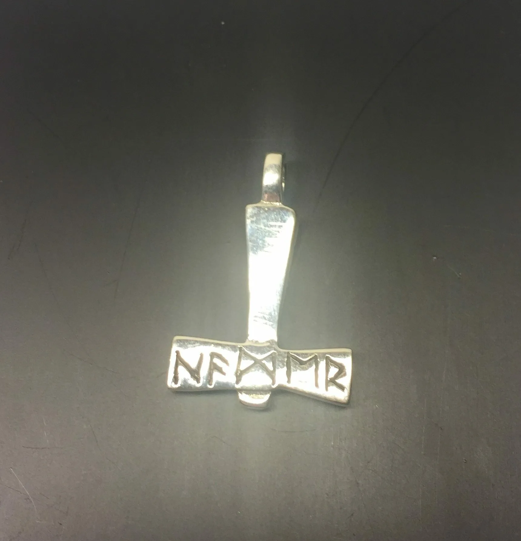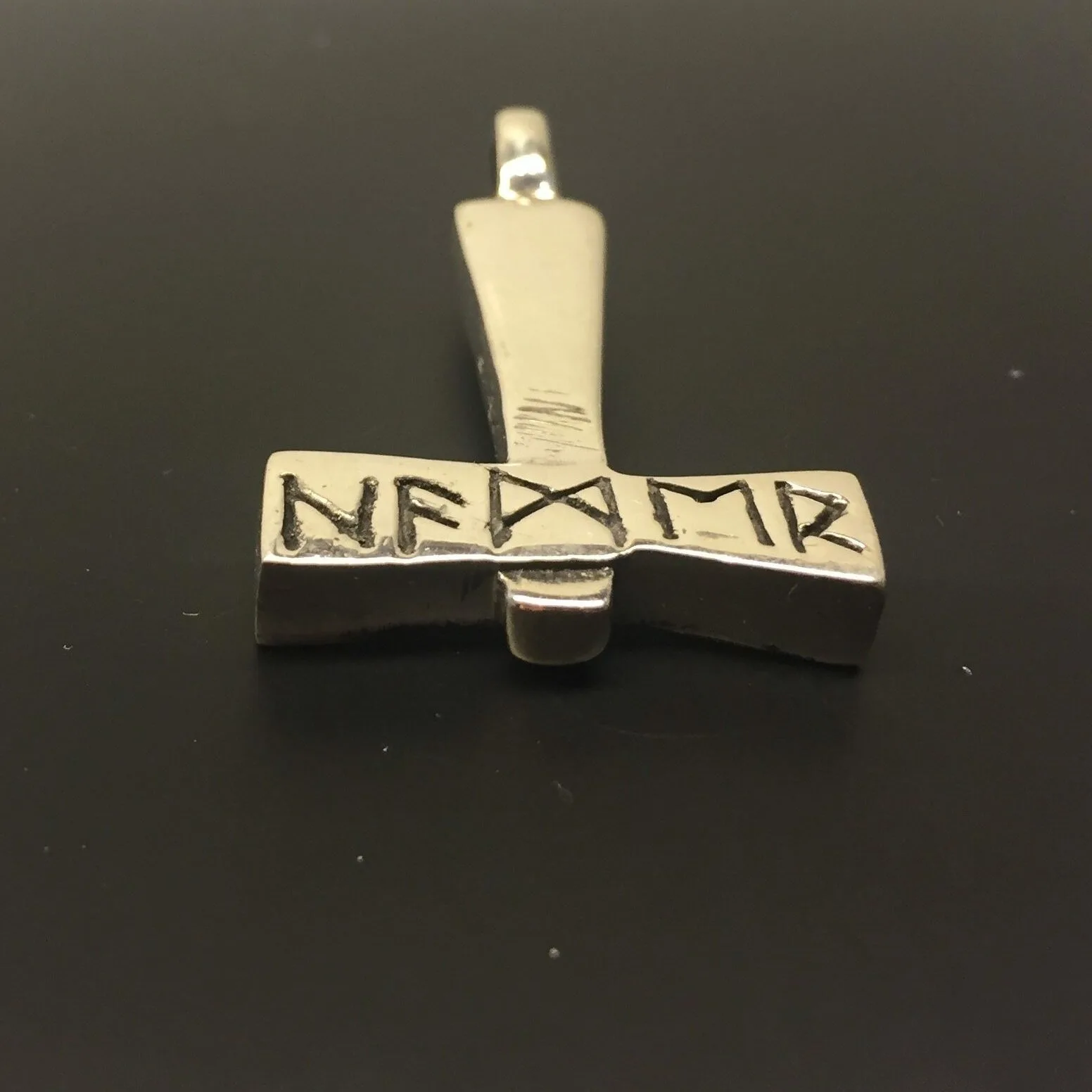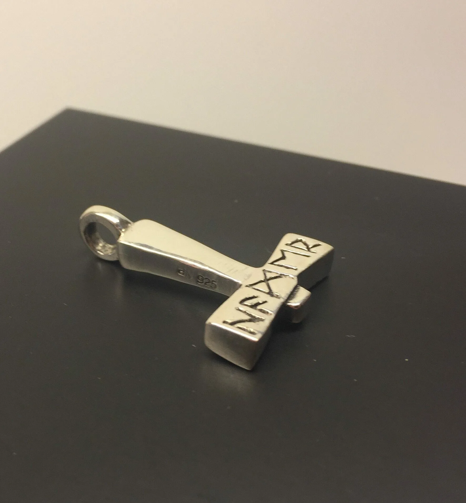 Denne thorshammer er massiv, med en lækker tyngde. Den er ren i udtrykket, kantet og glat uden pynt, bortset fra rækken af runer, som man mener betyder “Mjølner”.