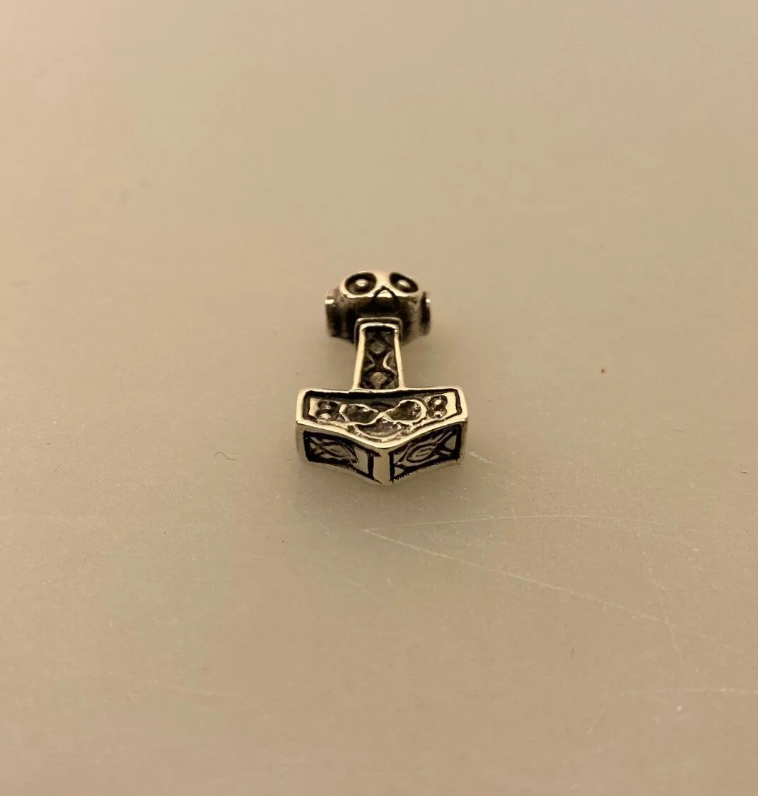 Flot lille, men kraftigt vedhæng. Lækker Thorshammer i smuk udførelse. Hammeren er massiv i ægte sølv. Vedhænget er dekoreret på alle sider og fint forarbejdet. Vedhænget er dekoreret med enkle krummelurer, evighedstegn og zig-zag. Hammeren er let oxideret i bunden, så mønsteret træder tydeligere frem.