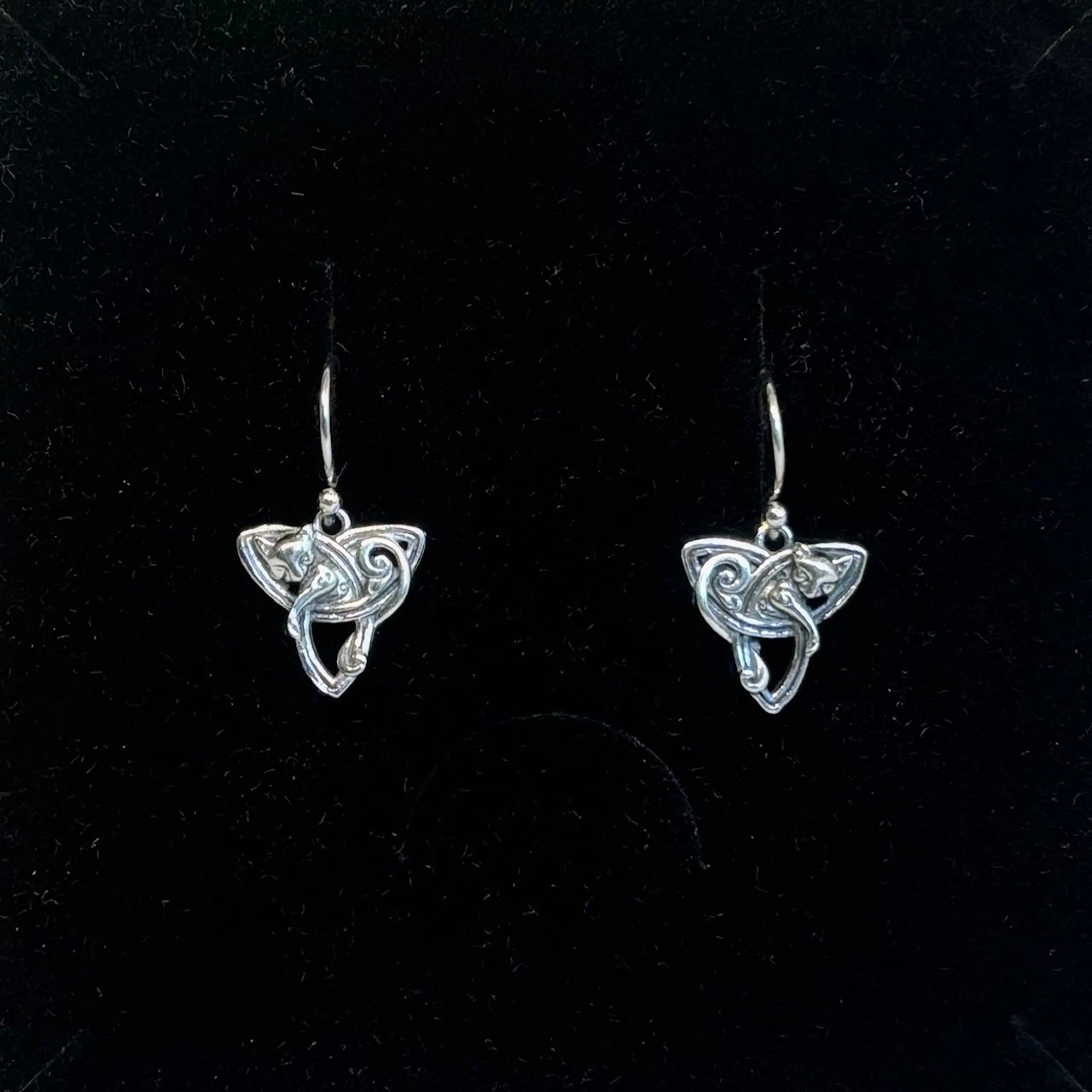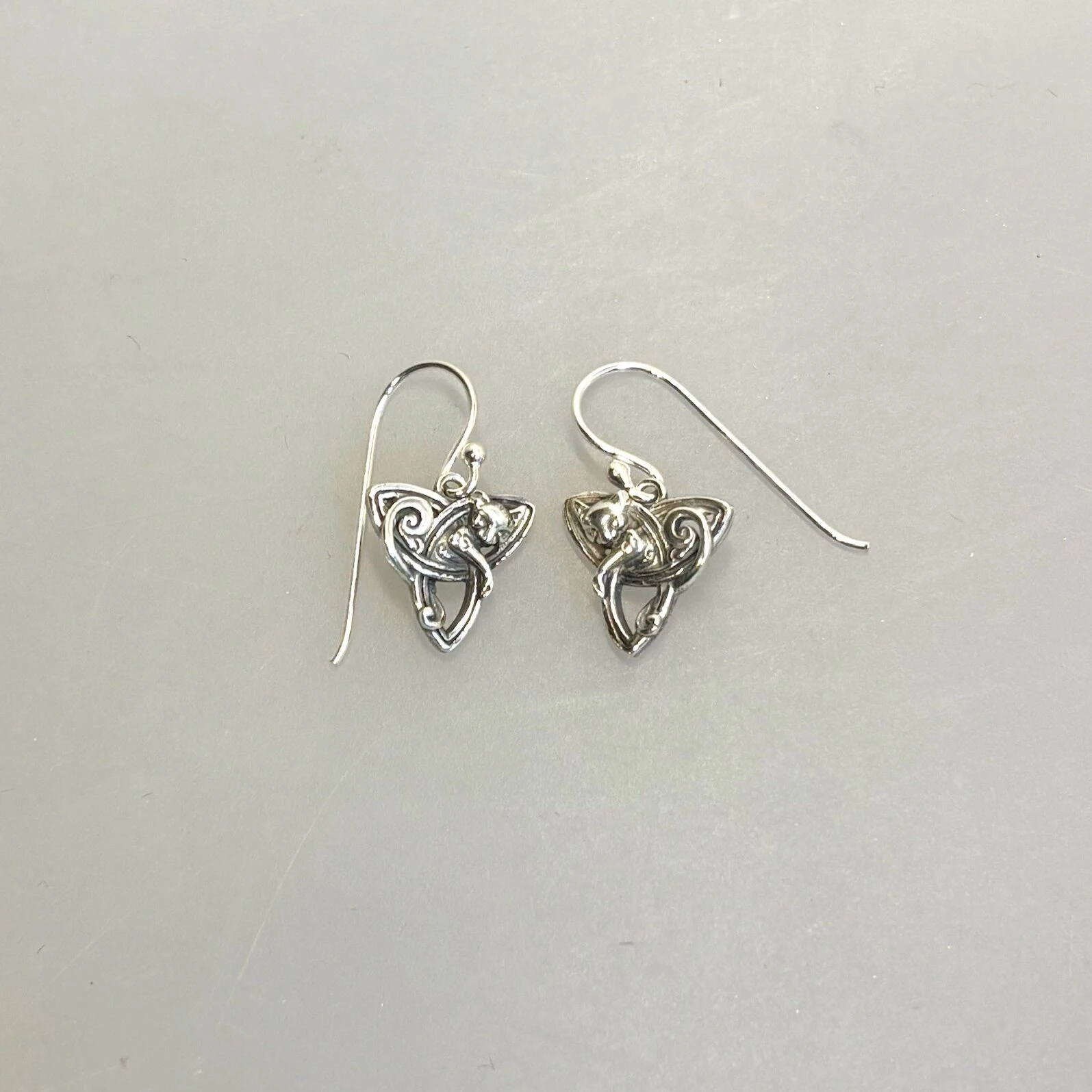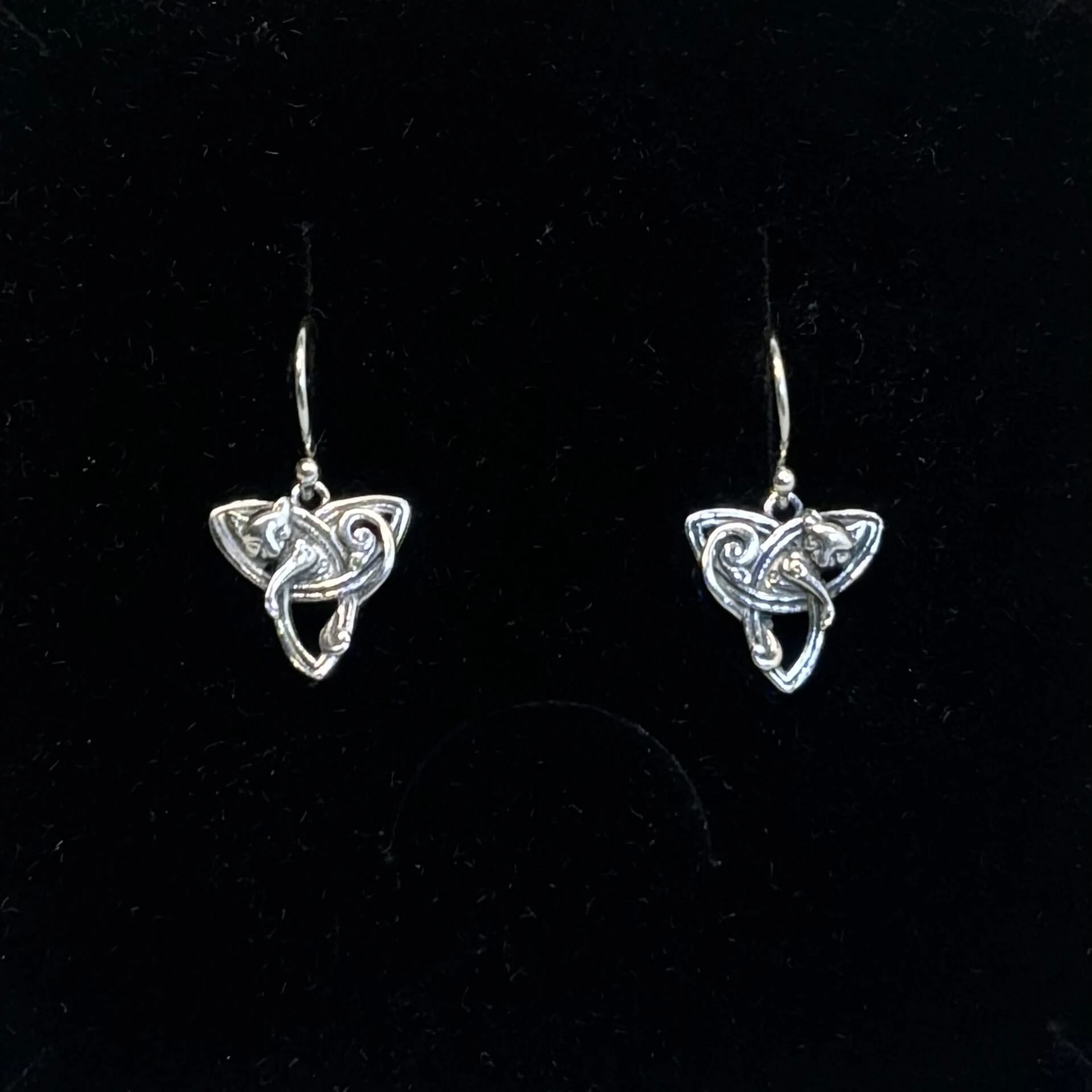 Fra en enkel sølvkrog hænger et lille trekantet vedhæng, udformet som en triskele – dvs. en evighedsknude med tre spidse hjørner, der symboliserer det magiske tal tre. Indeni den trearmede knude ligger en sød lille kat, med afslappede poter, svunget hale og et sødt lille katteansigt. Tilsammen viser øreringene Frejas to katte.