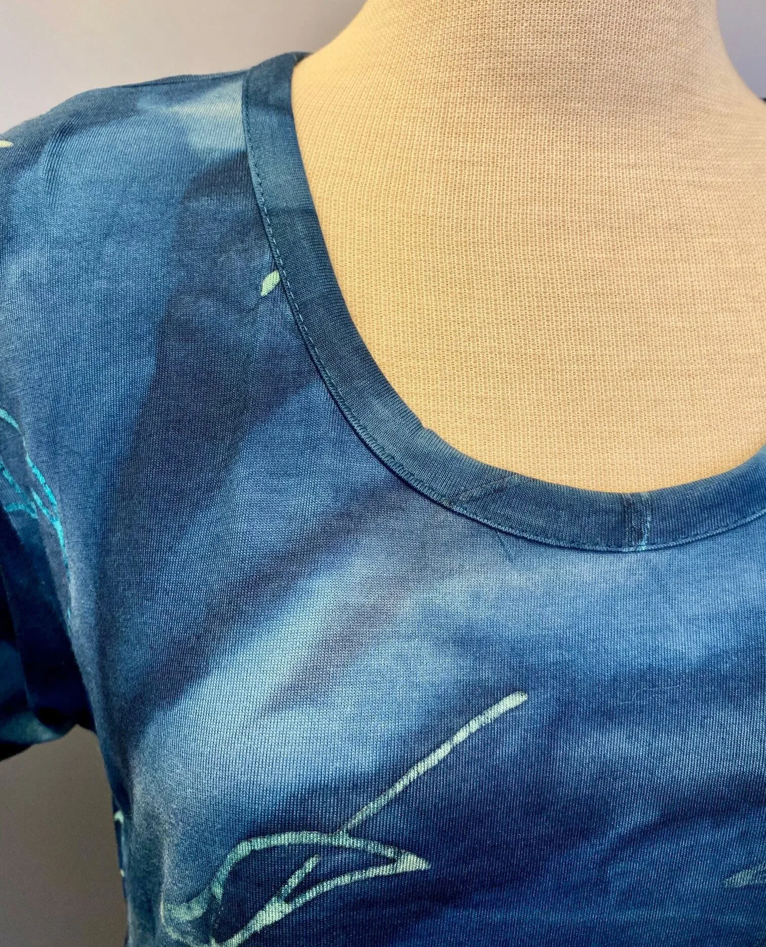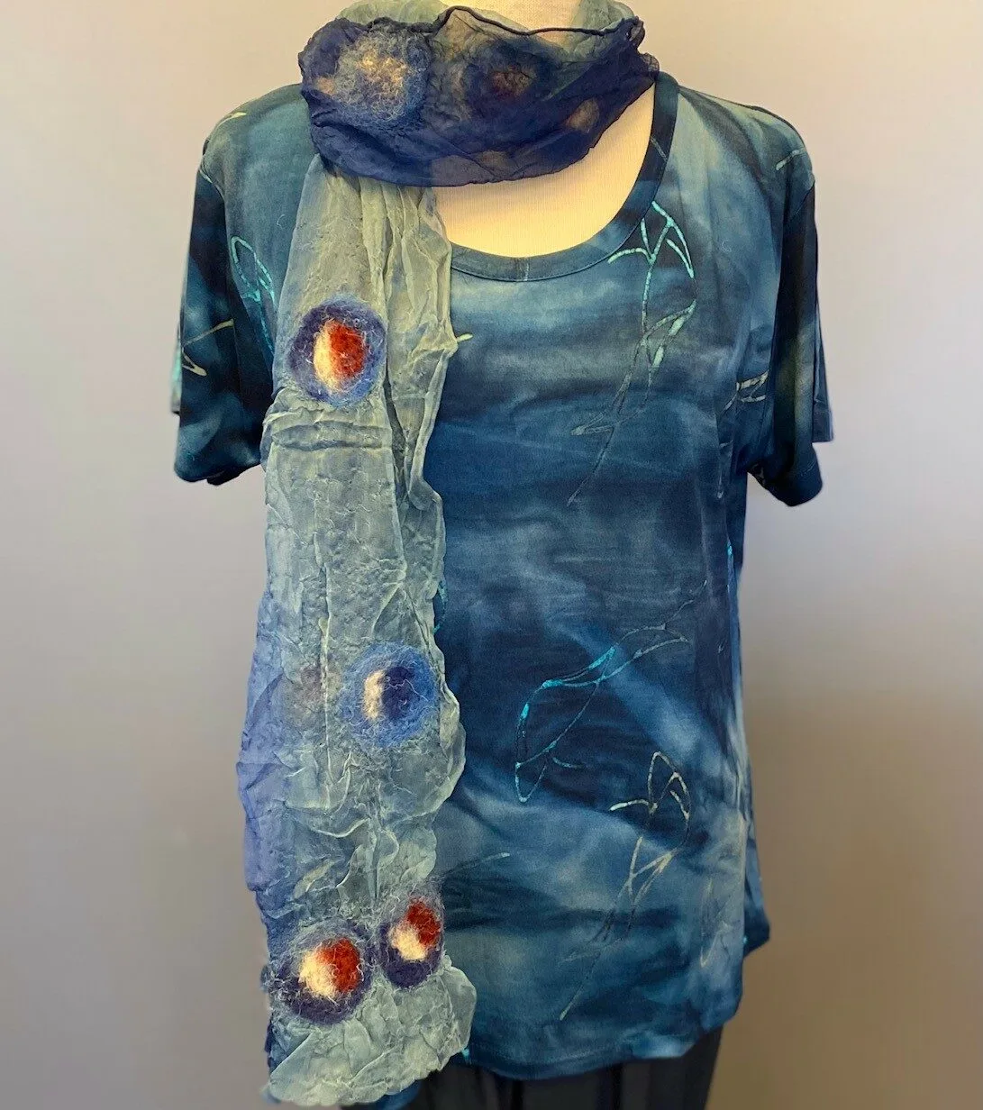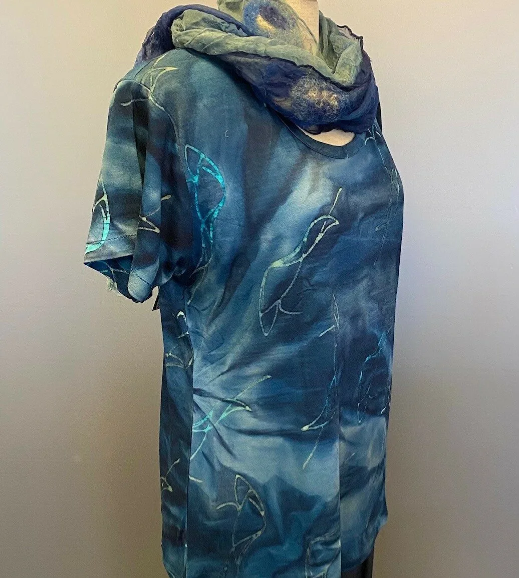 T-shirten er farvet med batikfarve og håndtrykt med det smukkeste mønster. Håndarbejdet betyder at hvert stykke er forskelligt, og da det er en lille produktion, får man desuden et eksklusivt stykke tøj, som man ikke finder i hver by. Farveteknikken med batikfarve sikrer meget holdbare farver, da tøjfibrene bliver gennemfarvet og ikke blot farvet på ydersiden, samtidig indebærer farveprocessen, at stoffet vaskes ved høj temperatur og kan derefter vaskes uden at krympe yderligere.