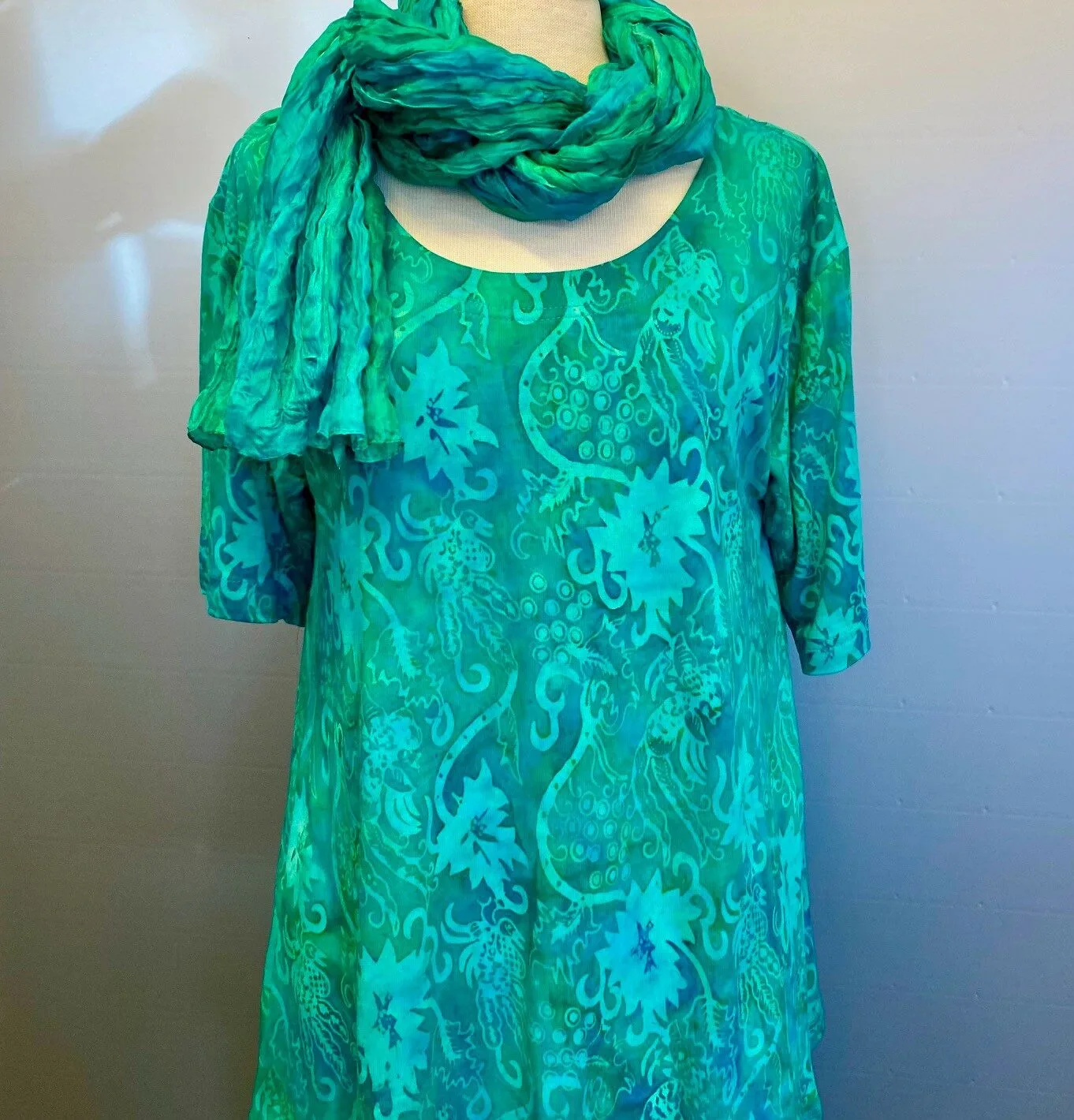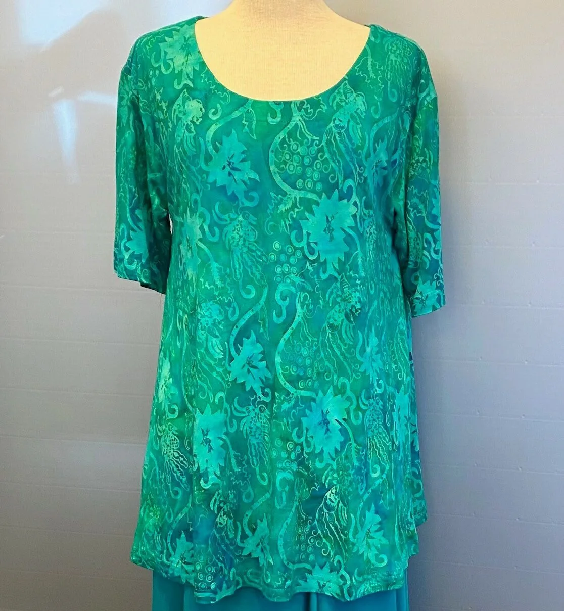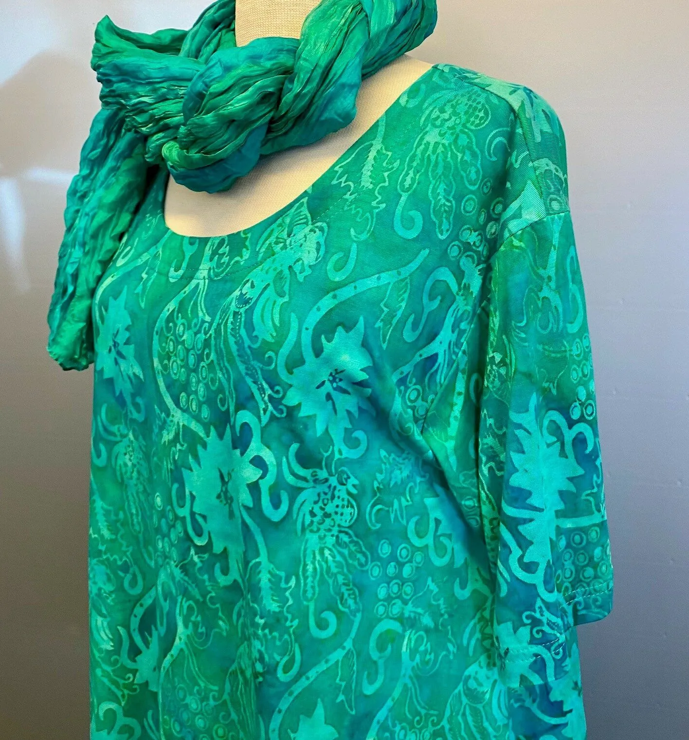 Klassisk bluse i A-facon af jersey håndtrykt med batik.