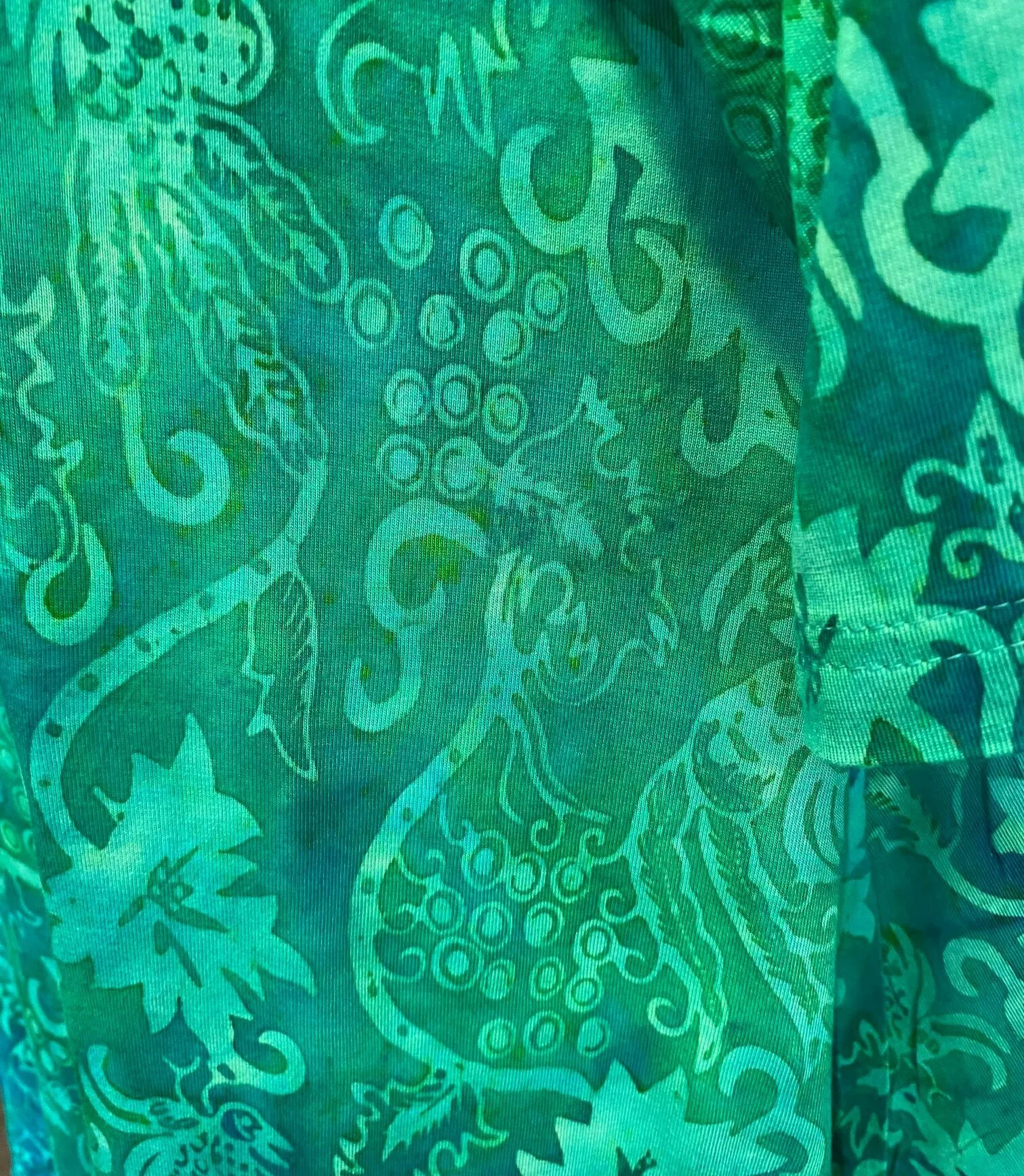 Stoffet er håndtrykt med batikfarve, hvilket sikrer holdbare farver og da stoffet vaskes i farveprocessen, betyder det endvidere, at tøjet ikke krymper i vask.