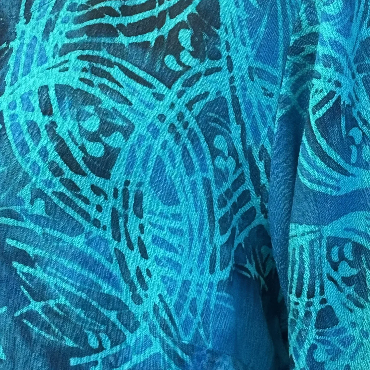 Stoffet er crincle-vævet og behøves således ikke at blive strøget. Det er håndtrykt med batikfarve, der gennem-farver fibrene. Denne proces sikrer holdbare farver og medfører det desuden, at stoffet ikke krymper i vask.