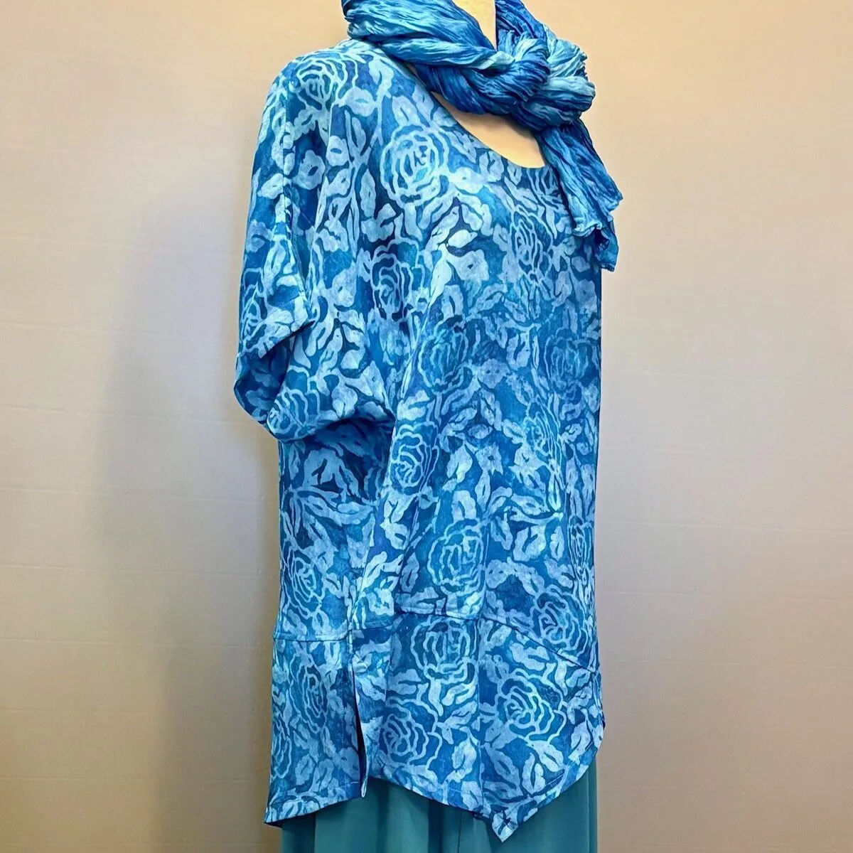 Skøn lang og løs bluse med flot “flow” i snit og stof, det vil sige at stoffet falder flot, når man bevæger sig. Modellen har flagermus ærmer, hvilket giver ekstra brystvidde, samt en moderat og klædelig bådudskæring.
