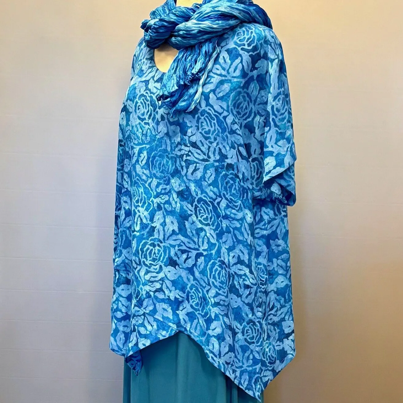 Stoffet er håndtrykt med batikfarve, hvilket giver holdbare farver og betyder at blusen ikke krymper i vask. Håndarbejdet indebærer endvidere, at ikke to bluser er ens, idet farver og placering af mønster altid vil variere en smule.