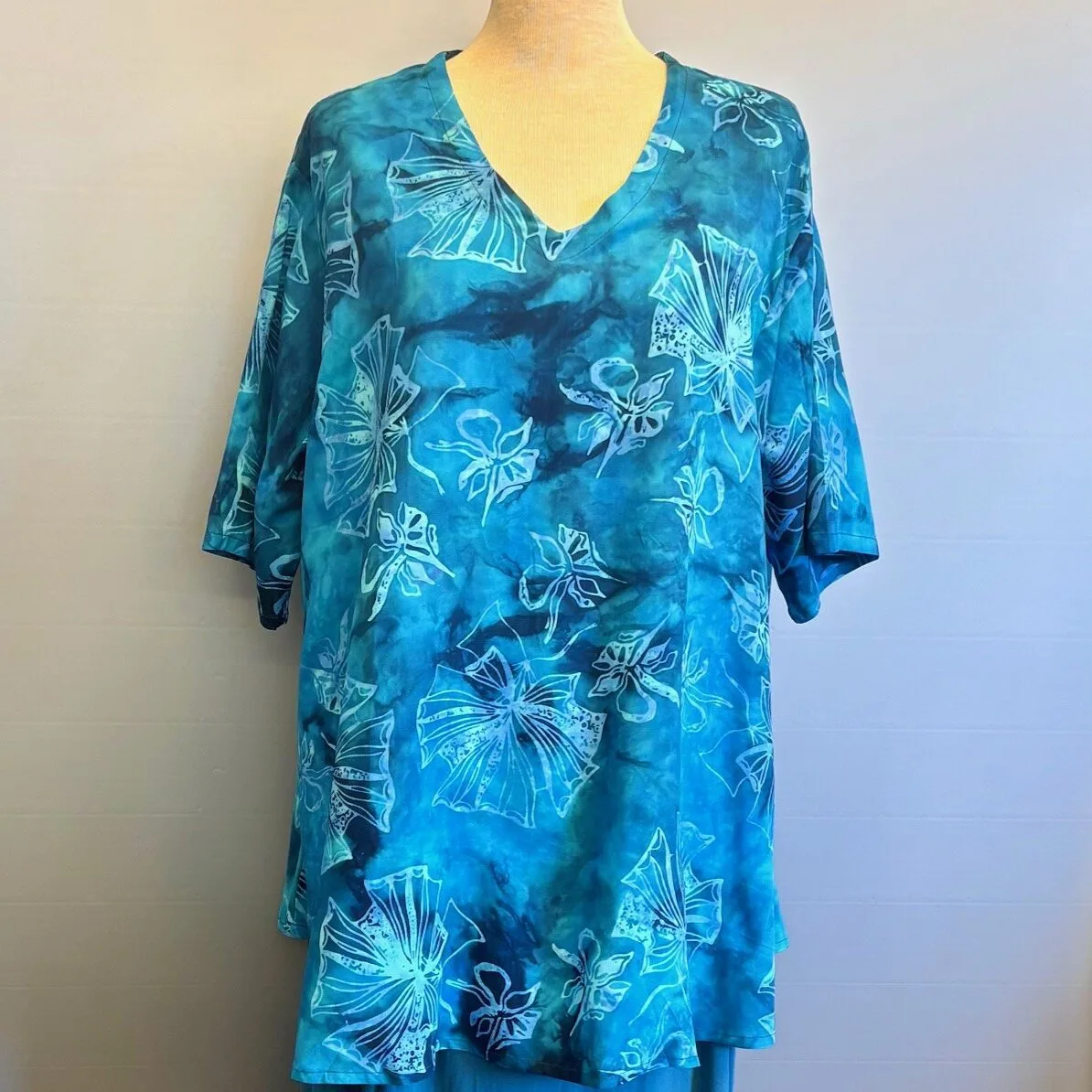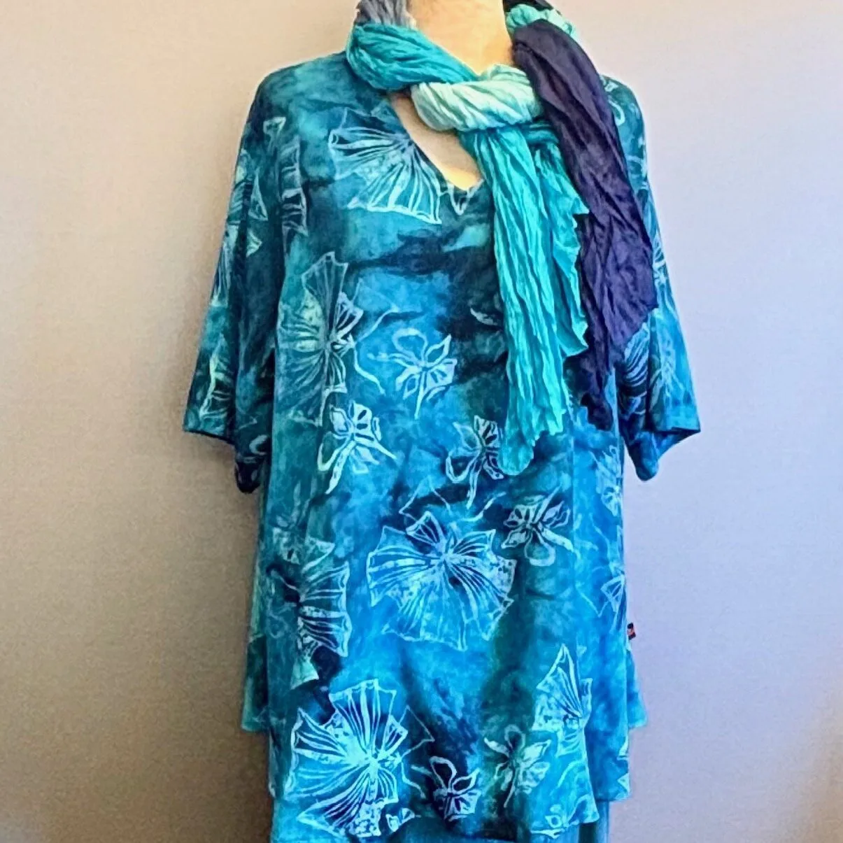 Stoffet er håndtrykt med batikfarve, hvilket giver holdbare farver og betyder at blusen ikke krymper i vask. Håndarbejdet indebærer endvidere, at ikke to bluser er ens, idet farver og placering af mønster altid vil variere en smule.