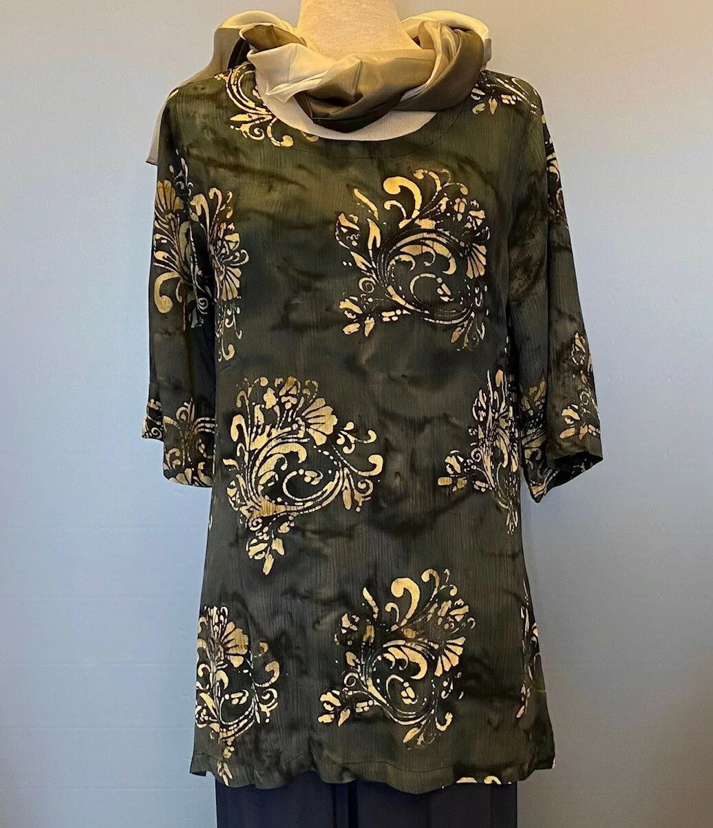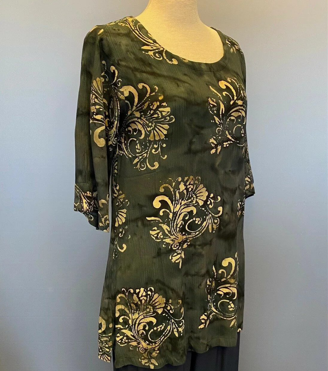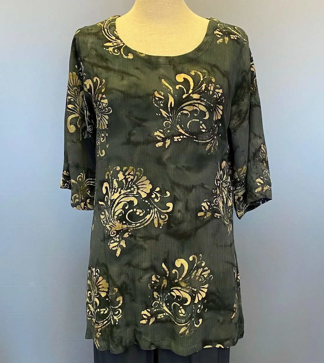 Løs bluse, lang tunika i ren batikfarvet viskose.