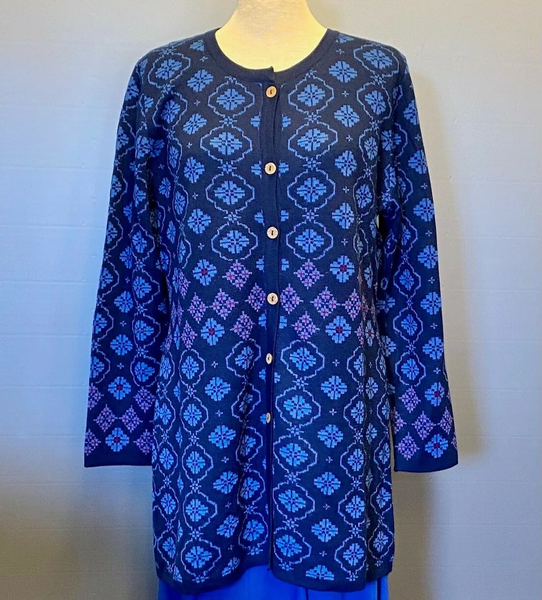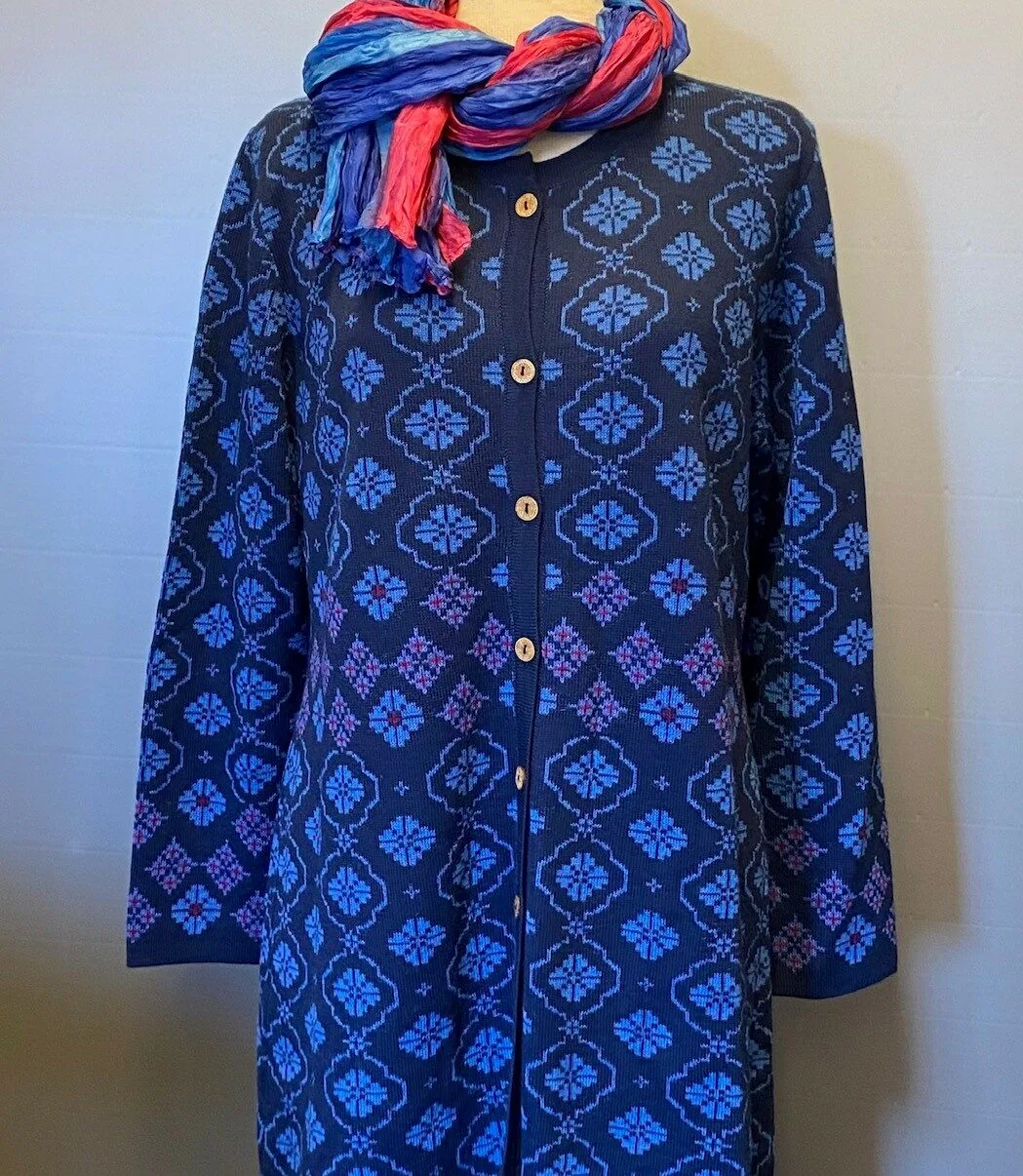 Modellen er strikket med et fint mønster i en flot farvekombination. Bundfarven er en smuk klassisk mørkeblå, som får et delikat pift fra det fine mønster i koboltblå og fuchsia. Trøjen er dobbeltstrikket jaquard, således at den er lige så flot og “lukket” på bagsiden. Modellen er lang med et komfortabelt snit. Cardiganen har en klædelig facon, og indtrykket af timeglas-figur understreges på fineste vis af den smukke bort med fuchsia detaljer.