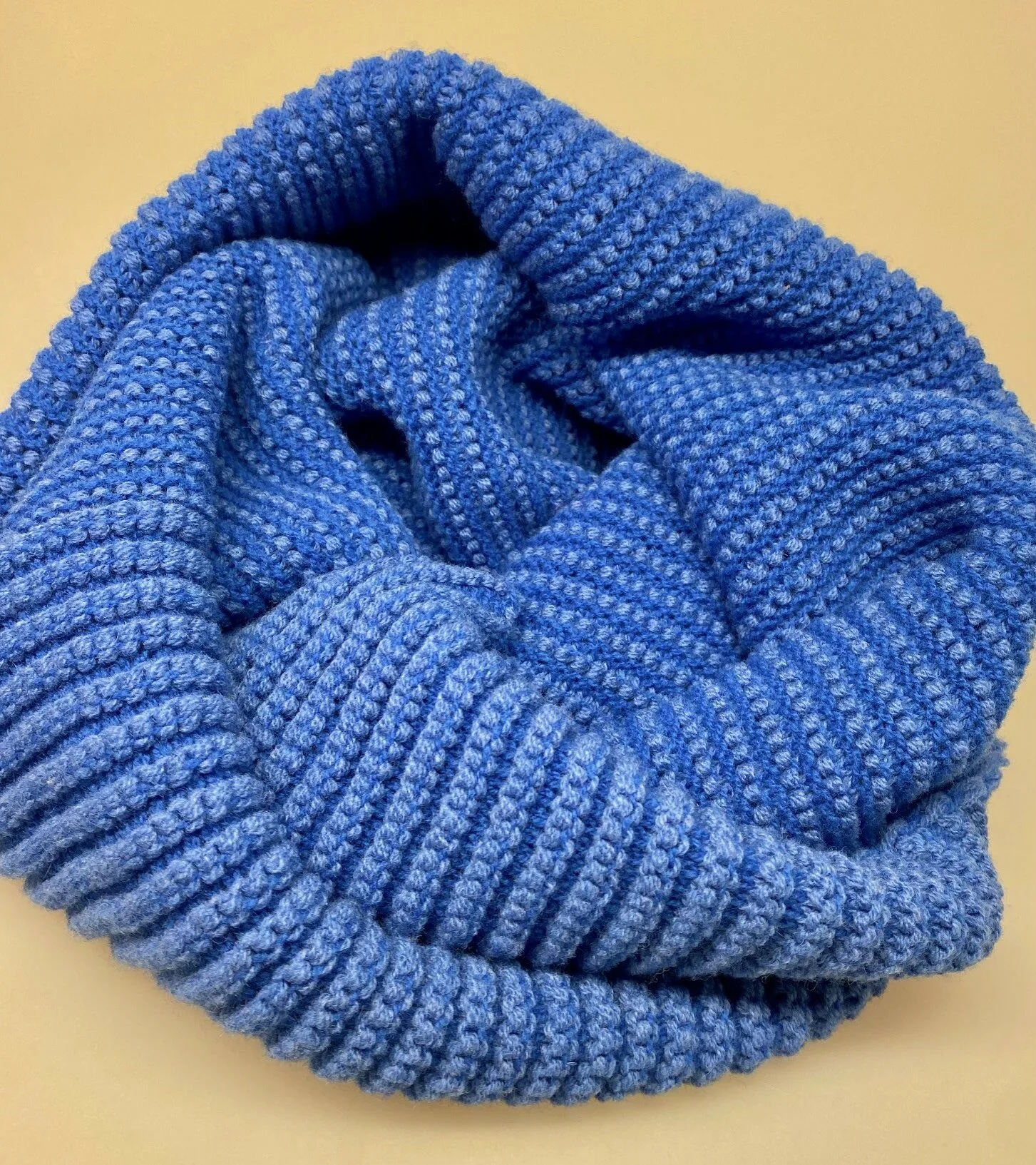 Dette flotte tørklæde er intet mindre end genialt! Det er let og lunt og strikket som en loop af skønt blødt uldgarn i den bedste kvalitet, som ikke kradser. Tørklædet er fint forarbejdet og strikket med rilleeffekt i forskellige nuancer – her i delikate klare blå nuancer. Det er konstrueret som en krydset loop, der blot tages på over hovedet og er let at sætte.