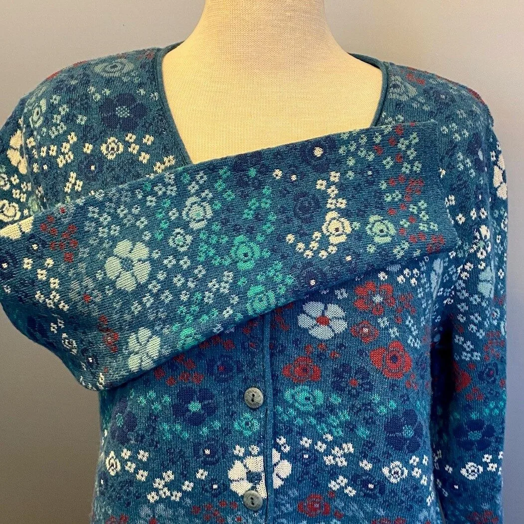 Cardiganen er klassisk i snittet, tilpas vidde og en klædelig længde. Halsudskæringen er let V-formet, så man kan variere udtrykket med en skjorte eller bluser under. Strikjakken den fremstår rolig og ensfarvet, da det smukke mønster er holdt tone-i-tone i blå toner, med enkelte detaljer i kontrastfarver. Strikken er blød og lækker, en god kombination af uld og bomuld, hvor man får blødheden fra bomulden, mens ulden giver den fornødne varme.