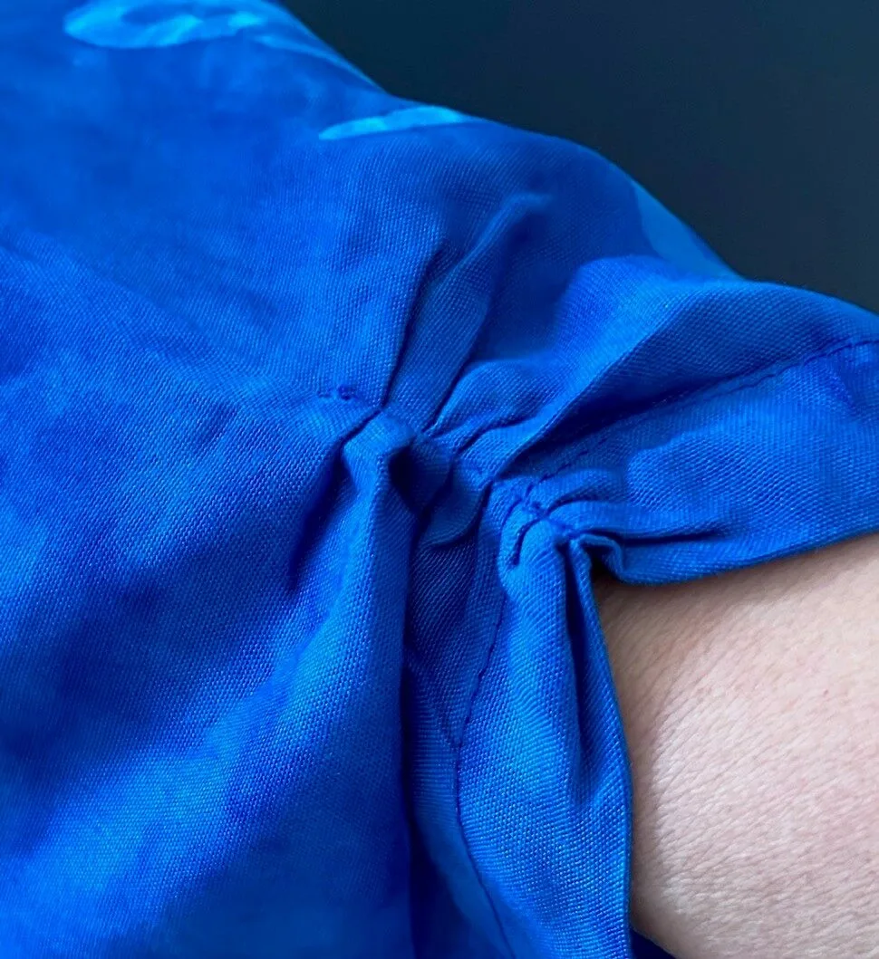 Smuk blå bluse med knapper og fin rynke detalje ved ærmet.