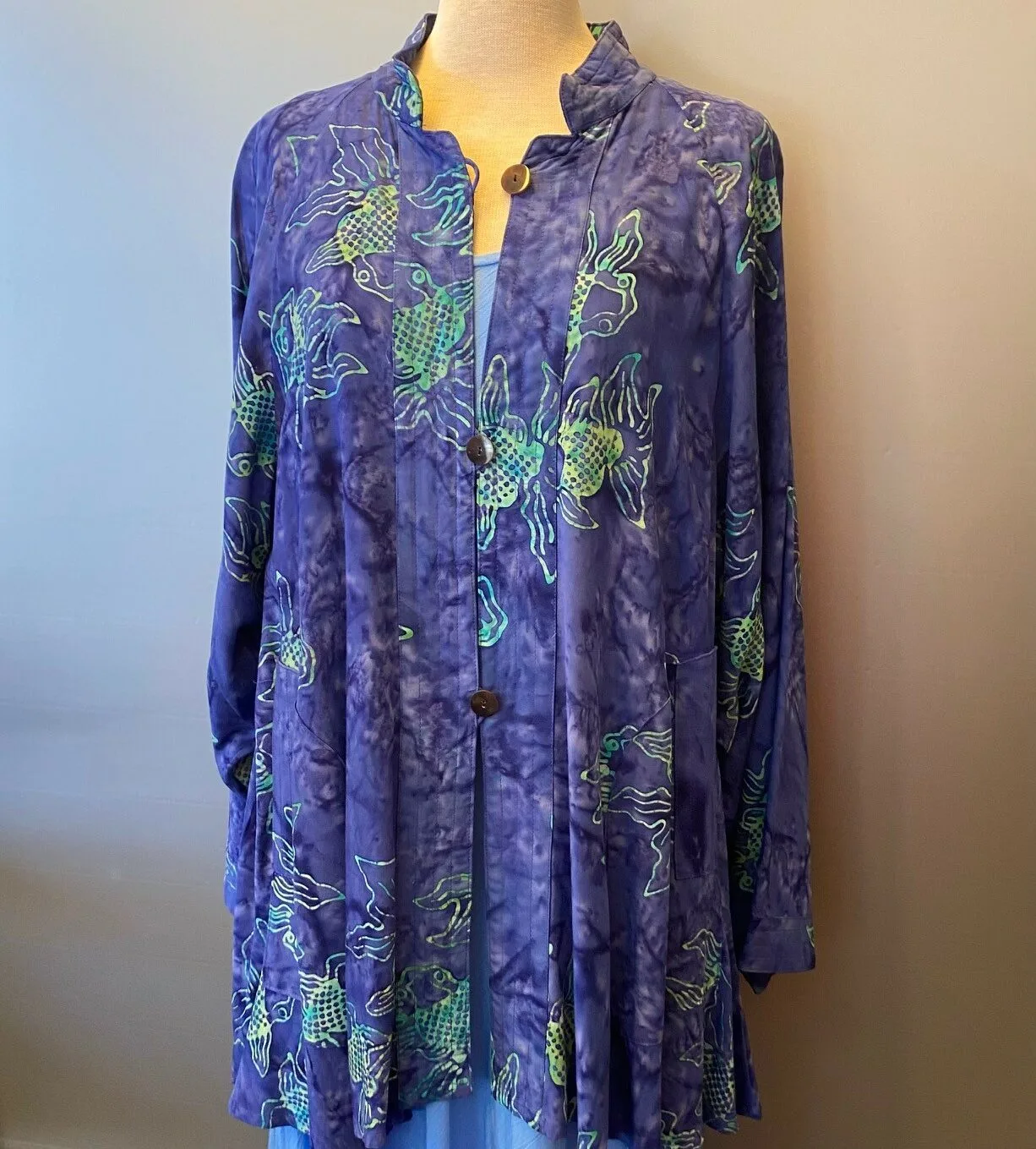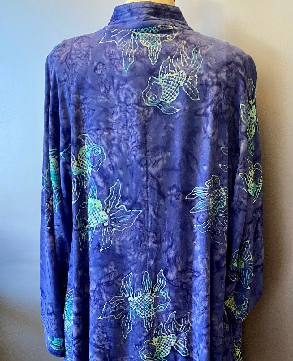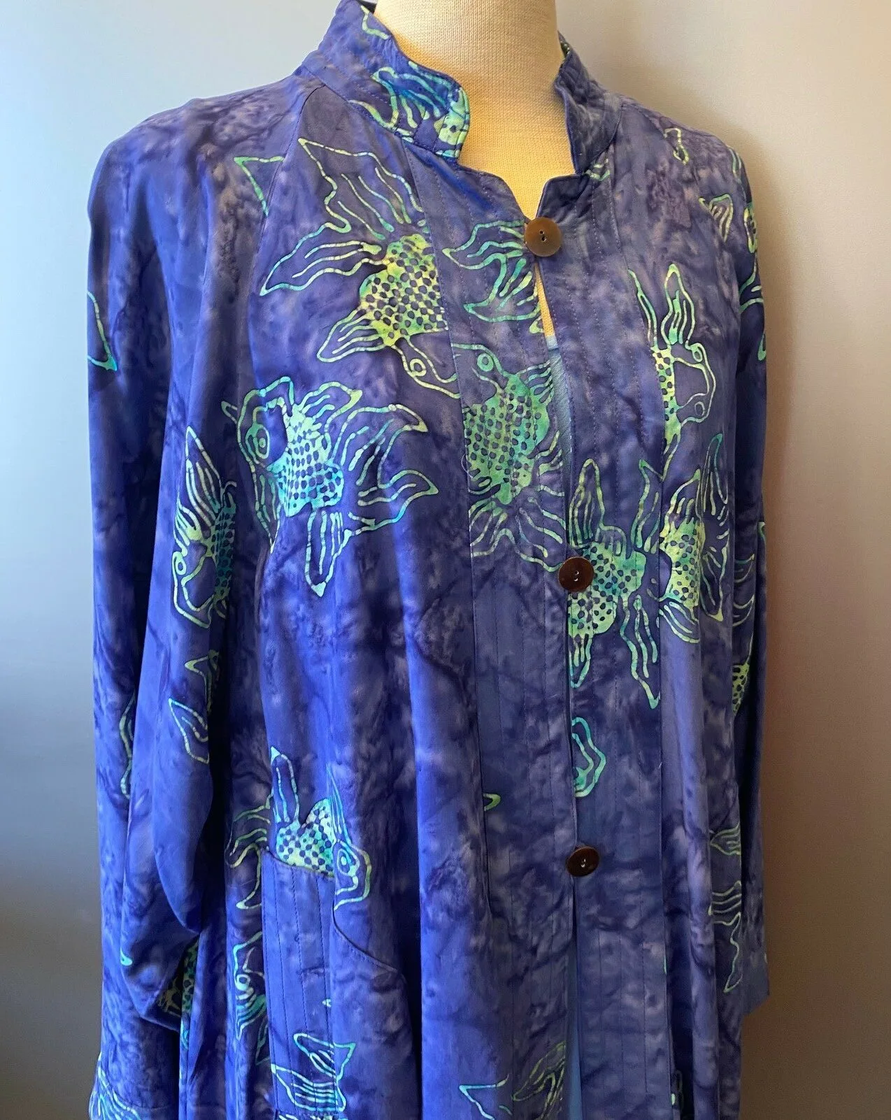 Farve: 2125A Violblå med fisk – en smuk og interessant variant, hvor bundfarven changerer i blålilla og det smukke motiv af lette fisk i turkisgrønt danner en flot kontrast.