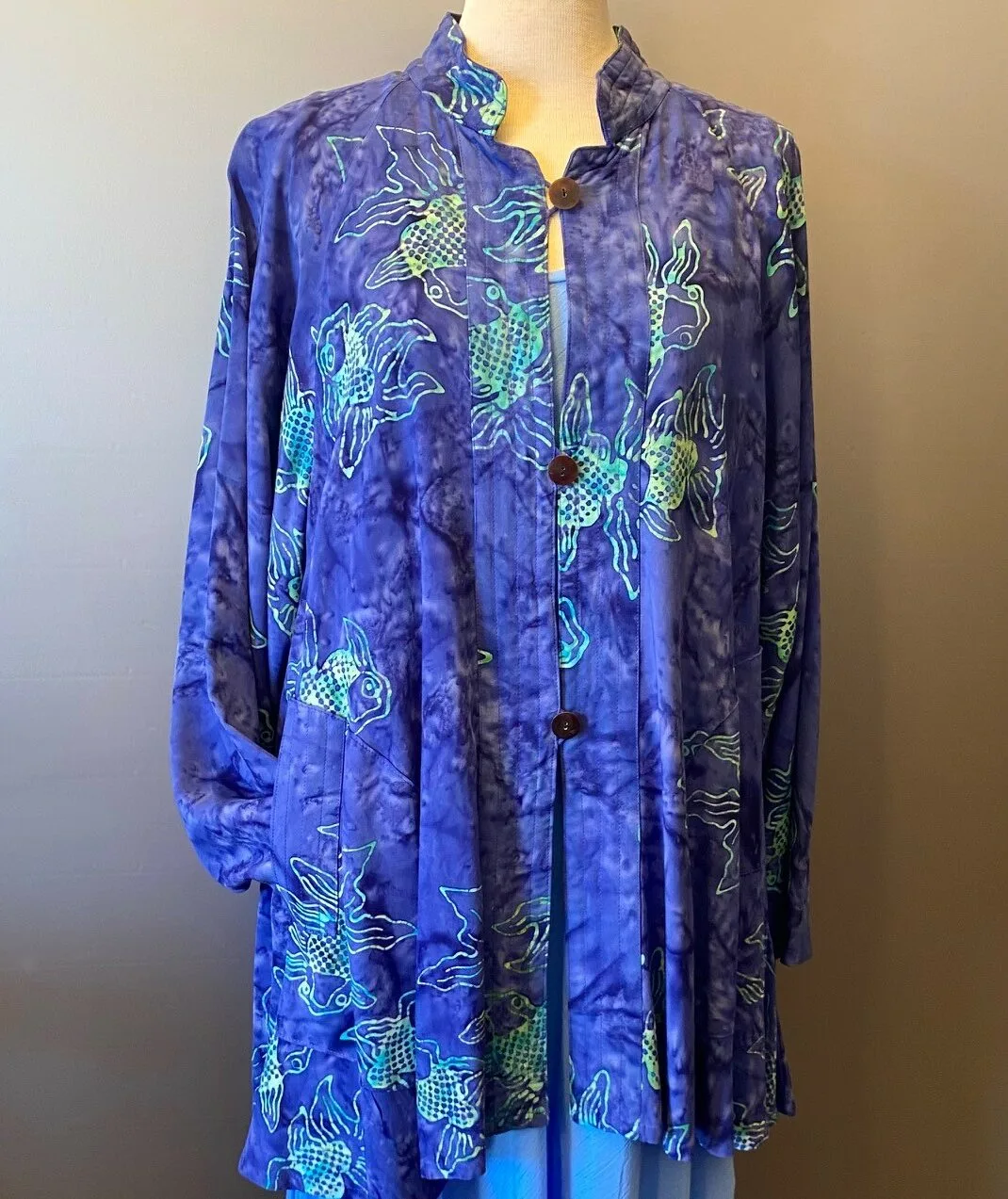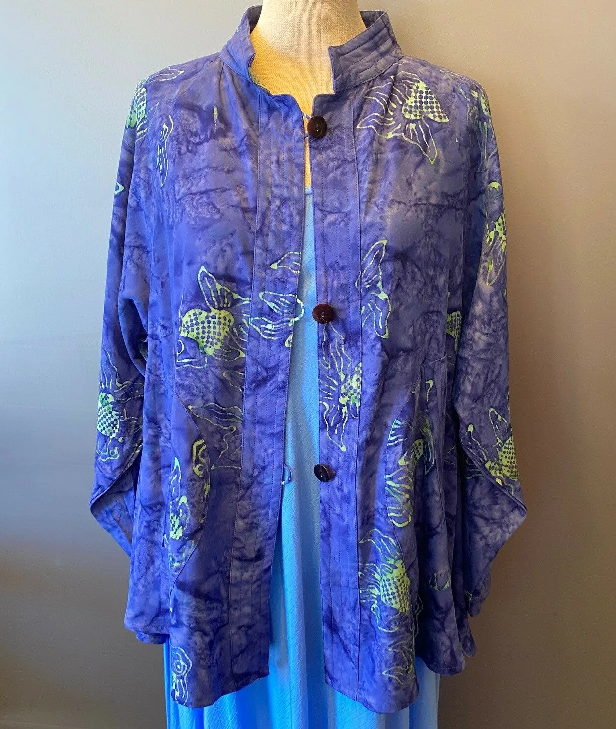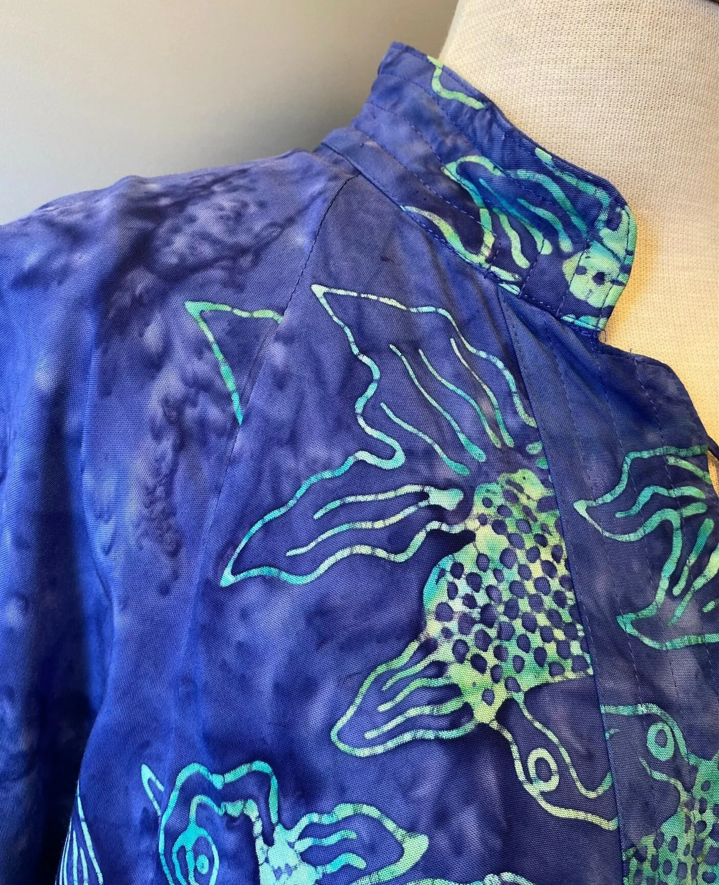 - Stoffet her er glatvævet, et lækkert stof med flot fald. Stoffet er endvidere håndtrykt med batikfarve, en teknik, der giver intense, smukke farver. Farveprocessen indebærer samtidig at tøjet er vasket og efterfølgende ikke krymper i vask. Indentrinfarverne gennemfarver tøjfibrene, så man får de mest holdbare farver.