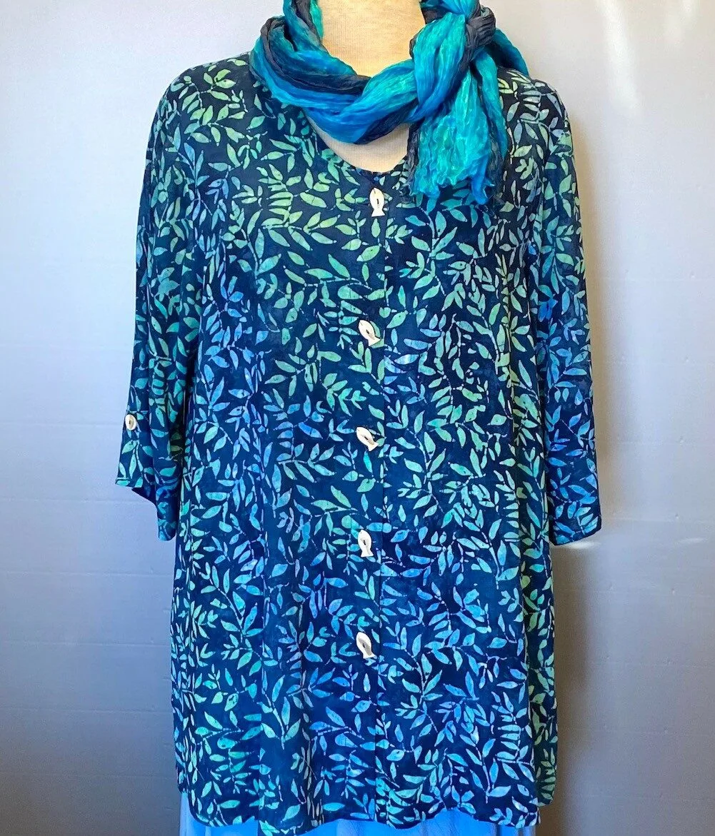 Stoffet chiffon vævet, det falder let, men virker ikke gennemsigtigt, når man har det på. Stoffet er håndtrykt med batikfarve, hvilket sikrer holdbare farver, betyder at tøjet kan vaskes uden at krympe, samt at farver og placering af mønster altid er en smule forskelligt.
