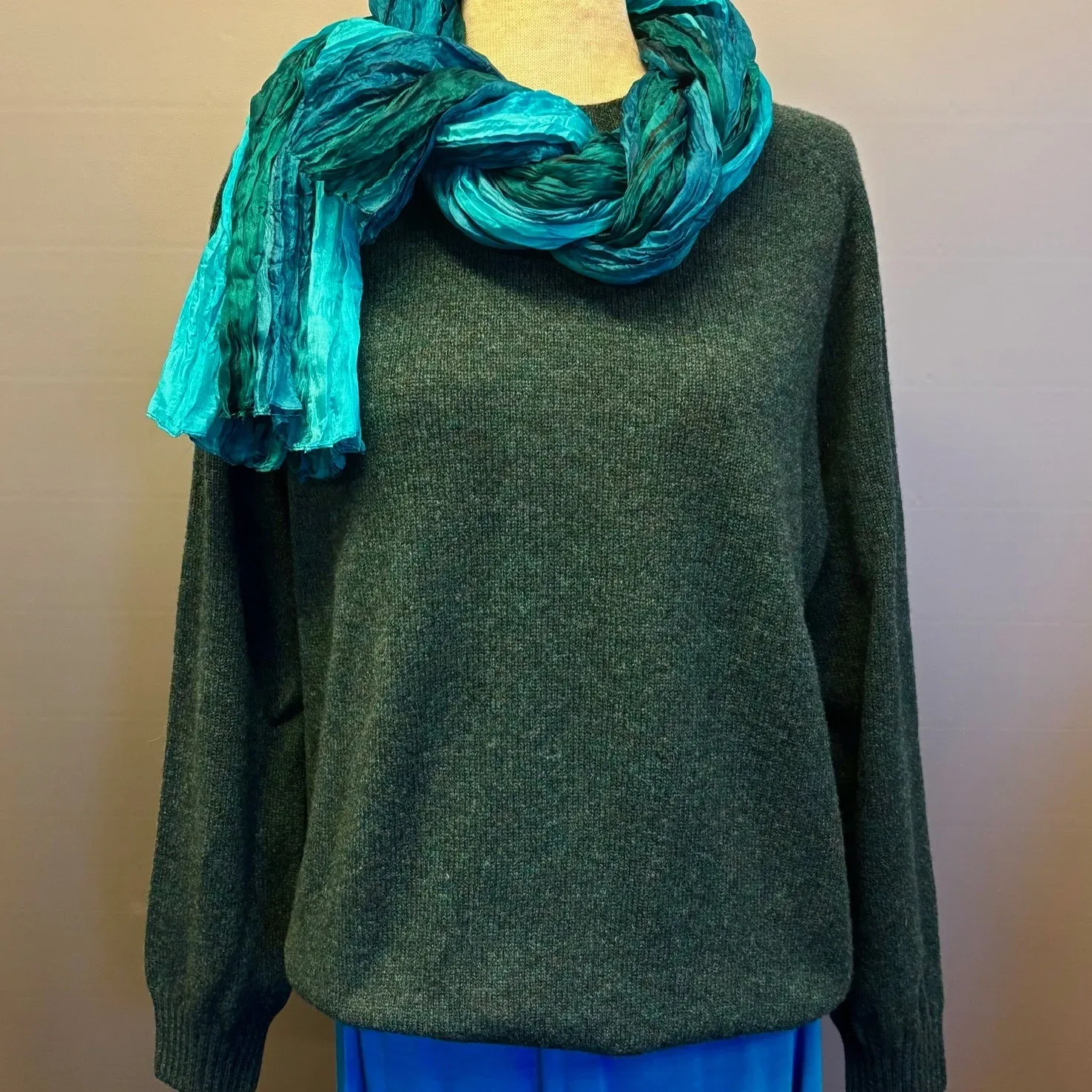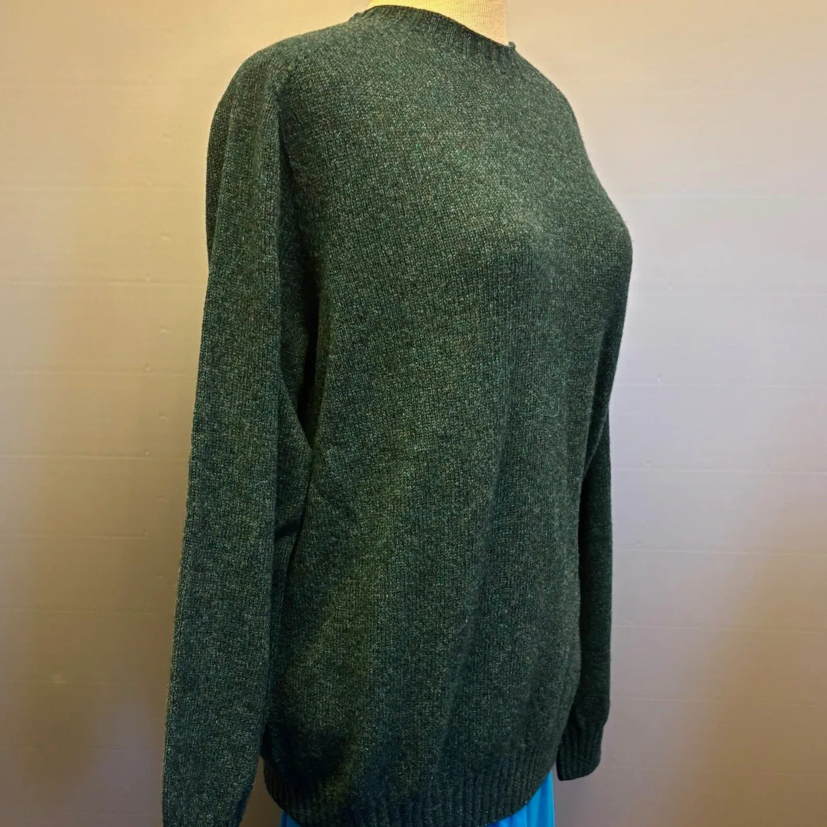 Trøjen fremstår umiddelbart ensfarvet petrol grøn, men ved nærmere øjesyn er der et let farvespil i garnet. Denne sweater er strikket i tynd, ekstra blød lammeuld. Garnet er ekstrablødt – Superfine lambswool. Strikken er tynd og lækker, og velegnet til indendørs brug. F.eks. under en blazer. Garntykkelsen er 2 ply.