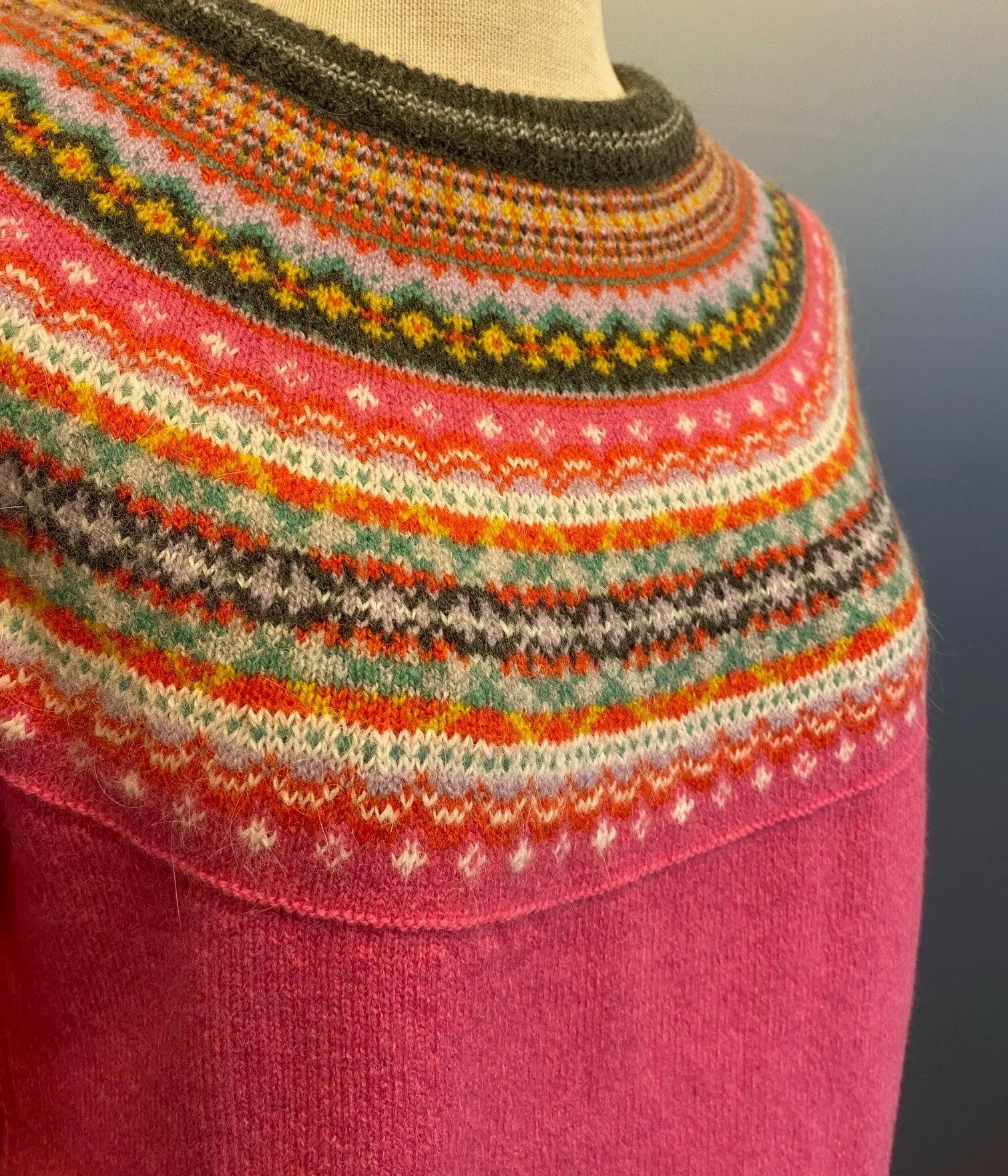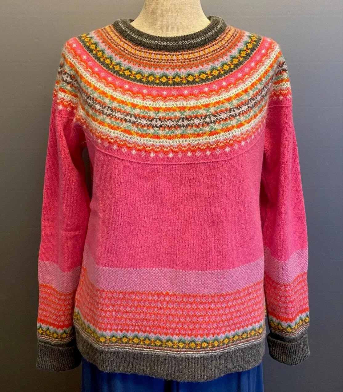 Farve: Fiesta – Cerise Pink variant. Hovedfarven er lækker frisk cerise pink, ribkanter ved hals, hofte og håndled er klassisk grå. Det smukke færømønster i naturhvid, orange, gul og grøn, samt lyslilla danner en fin kontrast til den delikate pink rosa og gør den denne strik interessant og særlig.