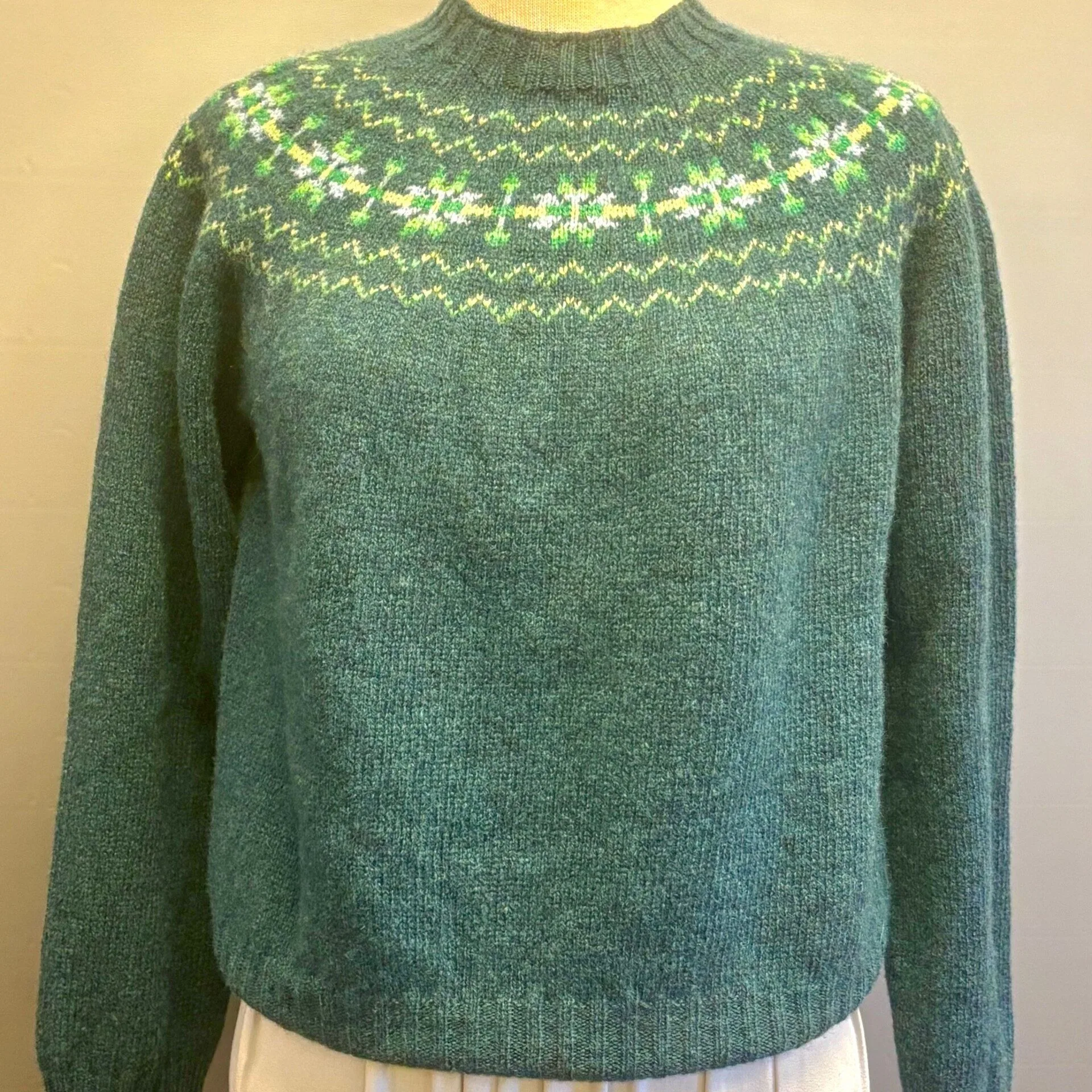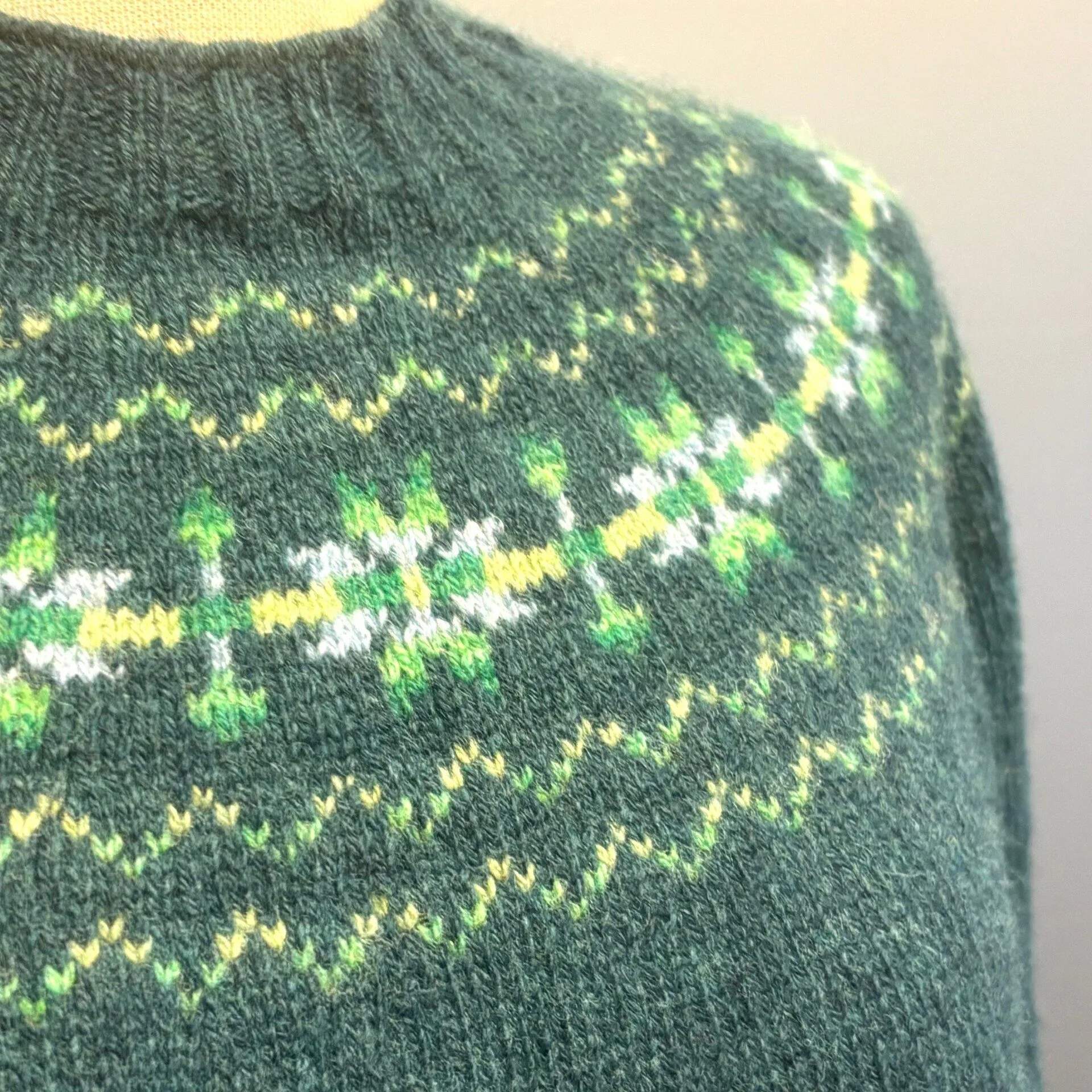 Mønsteret er inspireret af de klassiske færøske pullovere, hvor mønsteret over skuldrene går hele vejen rundt og ærmerne er sat til under bærestykket. Trøjen får derved en særlig pasform, der giver et slankt udtryk, med alligevel en god rummelighed, så den er behagelig at have på. Modellen her er cropped, det vil sige at den er en smule kortere og mere “boxy” i pasformen.
