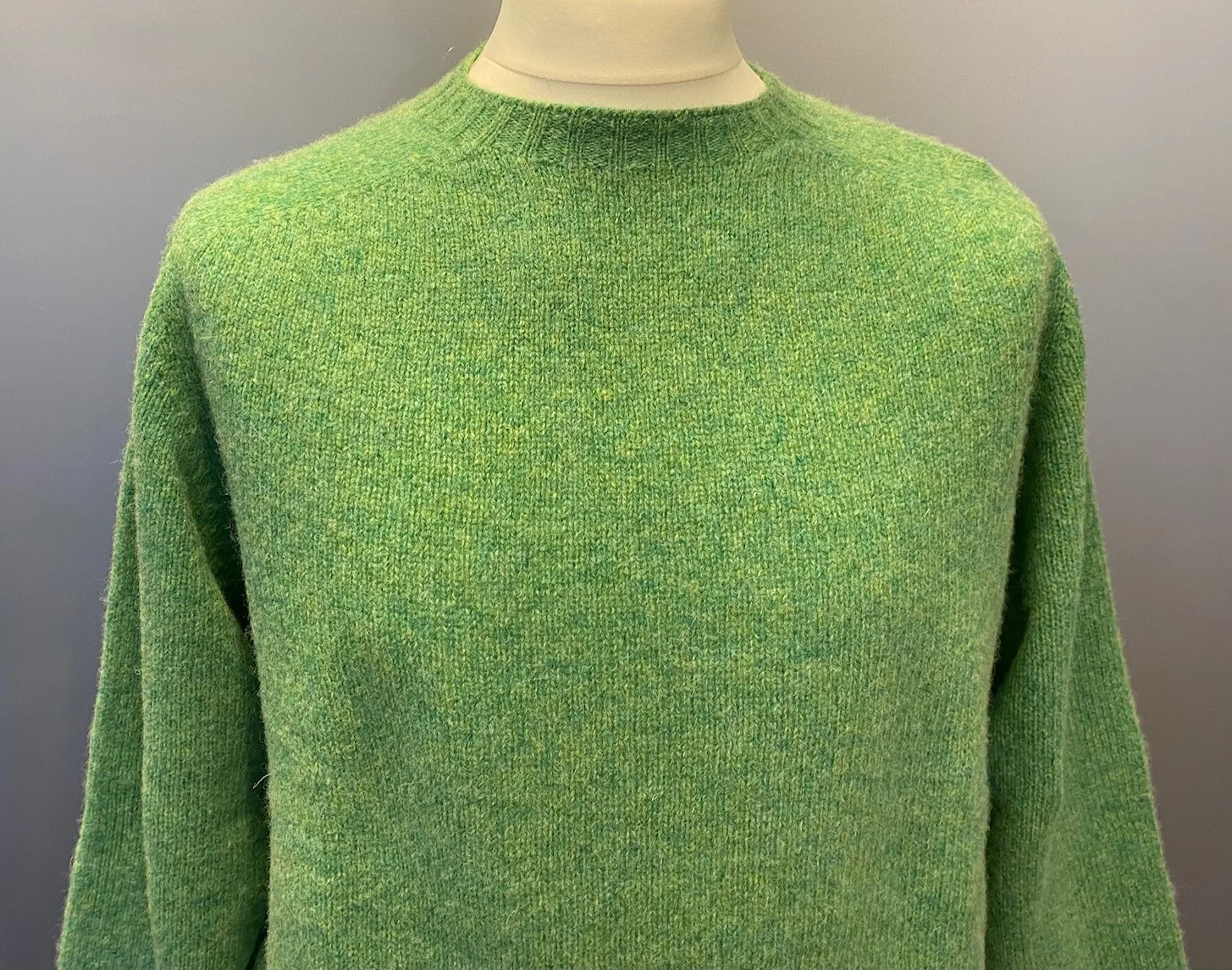 Den lette og lune pullover fremstår umiddelbart som ensfarvet grøn. Ved nærmere eftersyn ses imidlertid et fint farvespil i garnet, som giver liv og gør trøjen interessant, samtidig med at den har et roligt ensfarvet udtryk.