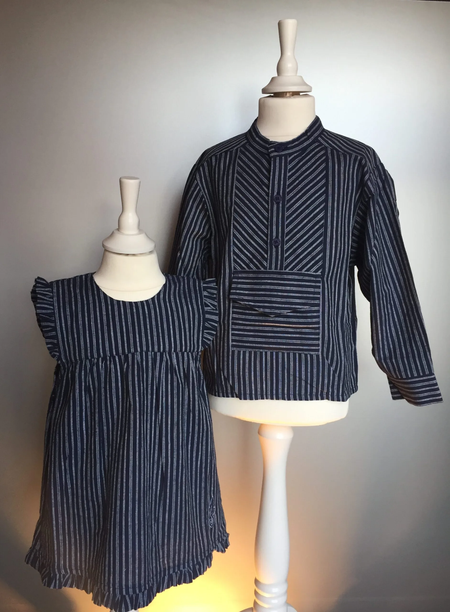 Børnekjole i bomuld – Mørkeblå dobbeltstribet (stof 01)